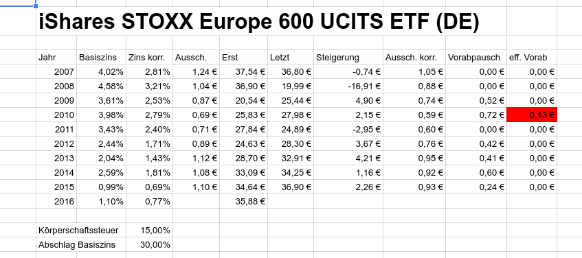 Regenschauer Juli 3, 2016 Hallo, ich habe mal die veröffentlichten Informationen der Behörden genommen und am Beispiel des iShares STOXX Europe 600 UCITS ETF (DE) der letzten Jahre berechnet was angefallen wäre. Dieser Fonds deshalb, da er heute zu den dauerhaft steuereinfachen gehört. Es wäre schön wenn ihr mal drüberschauen könntet, ob ich die Informationen alle richtig zusammengefügt habe. Hier der Link zur Google-Tabelle Ein Screenshot der Tabelle und einige Kommentare meinerseits: Ausschüttungen wurden um Körperschaftssteuer gemindert um die neue Regelung abzubilden. Die Vorabpauschale berechnet sich aus der Multiplikation des korrigierten Basiszinssatzes und dem Erstkurs, sind aber durch den Wertzuwachs gedeckelt. Sprich, in Verlustjahren gibt es keine Vorabpauschale. Die Vorabpauschale wird um die Ausschüttungen gemindert. Es zeigt sich, dass 2010 die Ausschüttungen nicht ausgereicht haben um die Vorabpauschale komplett zu neutralisieren. Es wurde also "zu wenig" ausgeschüttet. Das is umso überraschender als dass dieser Fond bisher als "dauerhaft steuereinfach" gilt. Könnt ihr meine Rechnung so nachvollziehen? Viele Grüße Diesen Beitrag teilen Link zum Beitrag