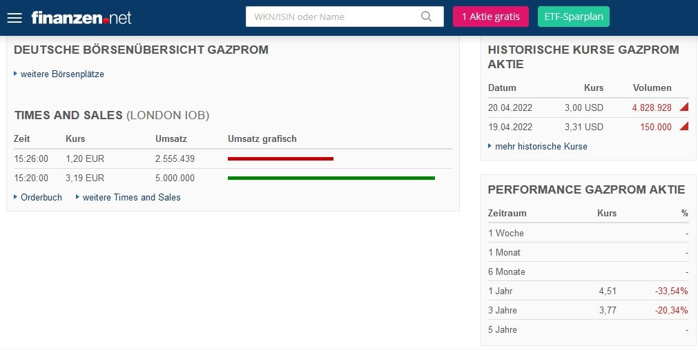 Alles Aktien März 24, 2022 Mit 15 Minuten Zeitverzögerung ist der Kurs bei aktuell 265 RUB. Da die ADR 2 Stammaktien darstellt würde das knapp 5 EUR je ADR bedeuten. Unabhängig von der Gefahr einer Enteignung und Handelbarkeit in EU/US, sieht das für "treue" Aktionäre aktuell nicht schlecht aus. Diesen Beitrag teilen Link zum Beitrag