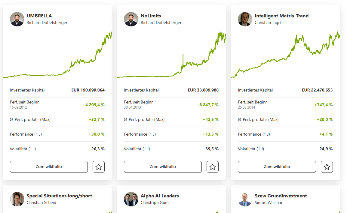 PapaPecunia vor 3 Stunden Nur damit man sich mal einen Eindruck machen kann, hier die drei Wikifolios mit der höchsten investierten Summe. Allein die Top-10 haben ca. 350 Mio. Kapital auf sich vereint. Ich habe von den fünf Herren da unten bis vor 15 Minuten nur Simon Weishar gekannt Diesen Beitrag teilen Link zum Beitrag