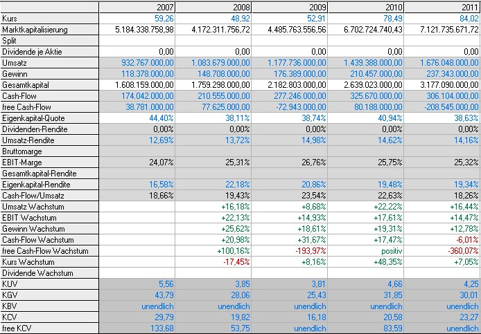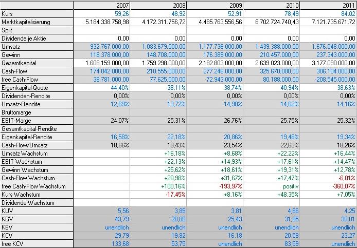 * erlebte letzten Freitag (1.6.) einen Rückgang um 2,4 Prozent, aber den Grund dafür sehe ich positiv: Die Analysten hatten noch bessere Zahlen erwartet, "leider" sie waren nur sehr gut. Umsatz- und Gewinnzahlen der letzten 3 Jahre sind solide bei 18% Wachstum. Diluted EPS $2,80 -- nichts davon wird als Dividende verteilt, weil für Wachstum (z.B. in Europa) gezielte Zukäufe notwendig sind;
