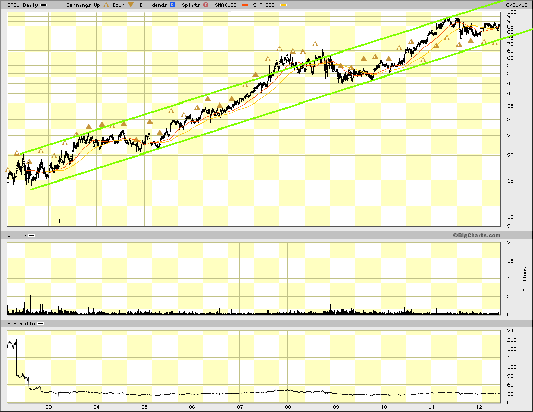SRCL's Geschäftsfeld (Entsorgung von gefährlichen Abfällen bei Krankenhäusern, Blutbanken, Pharmaunternehmen) ist konjunkturunabhängig und wird stark von staatlichen Auflagen unterstützt. Ich kenne keine ernsthaften Konkurrenten (Clean Harbors (CLH) käme noch am nächsten), die meisten sind, wie wie Waste Management (WM) und Republic Services (RSG), allgemeine Müllentsorger, keine Spezialisten wie SRCL, und haben entsprechen relativ schmächtige Zahlen. IBD ratet SRCL als Nummer 1 unter 33 Entsorgern.