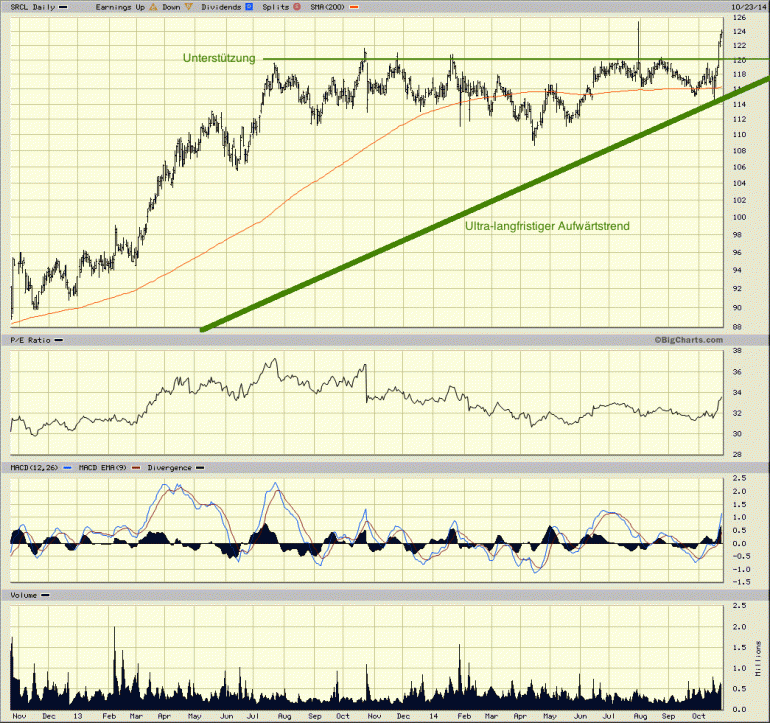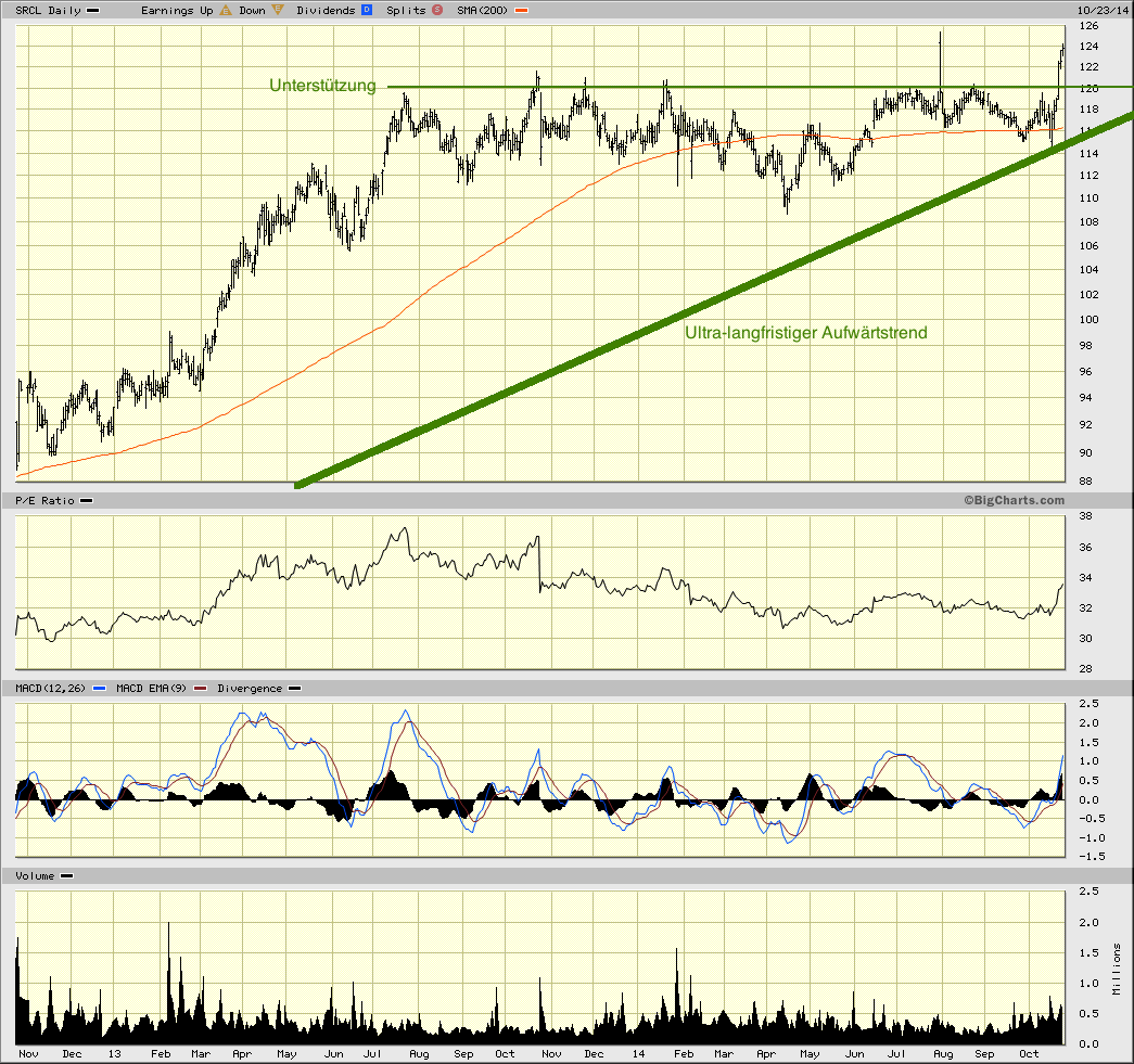 Ich erwarte, SRCL längerfristig zu halten. Angesichts einer PEG-Ratio (price-to-earnings-growth) von 1,6 ist die Aktie für mich ein Investment, kein Trading-Instrument.