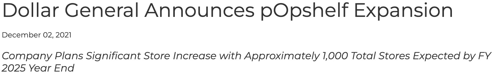 Toni März 19, 2022 · bearbeitet März 19, 2022 von Toni Im folgenden Video wird die neue Ladentyp pOpshelf vorgestellt: I went to the new dollar store for wealthy people!! | pOpshelf DG hat mittlerweile 18.000 normale Läden, und nur ca. 55 pOpshelf-Läden. DG plant in einigen Jahren 1000 pOpshelf-Läden zu haben. Diese haben eine wesentlich höhere Gewinnmarge, deswegen ist das so interessant... https://newscenter.dollargeneral.com/popshelf/dollar-general-announces-popshelf-expansion.htm Diesen Beitrag teilen Link zum Beitrag
