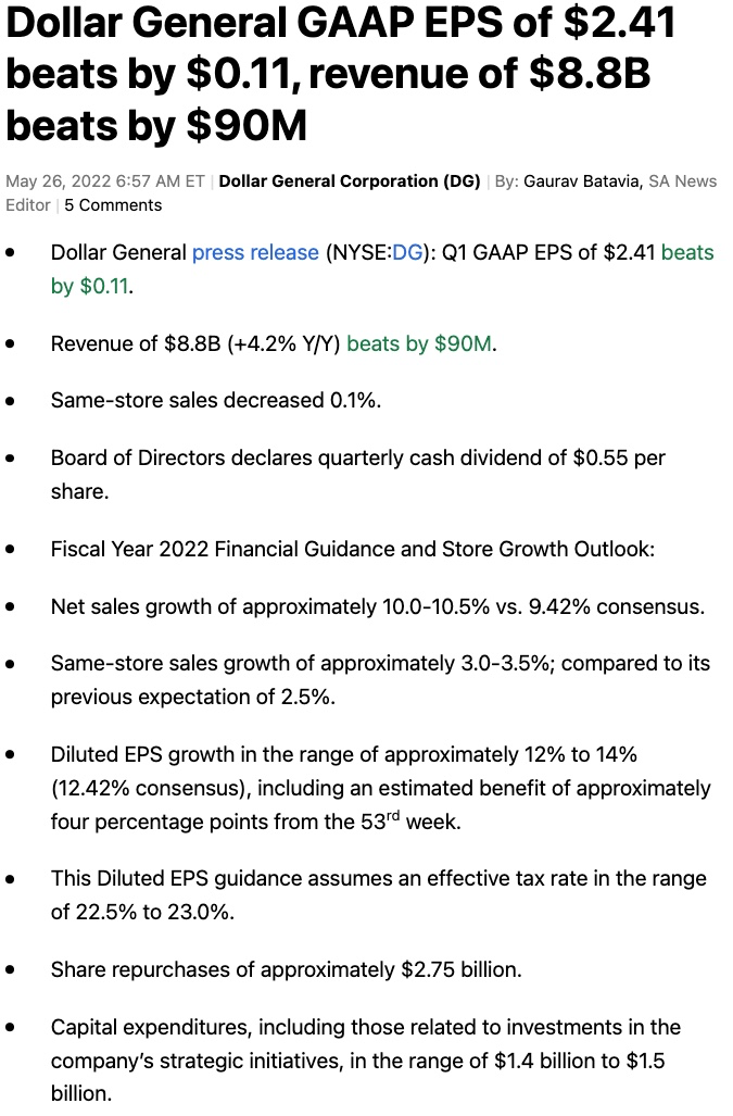 Toni Mai 26, 2022 https://seekingalpha.com/pr/18809687-dollar-general-corporation-reports-first-quarter-2022-results Diesen Beitrag teilen Link zum Beitrag