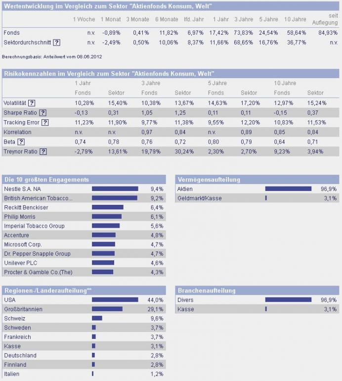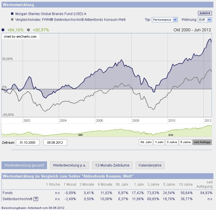 ghost_69 Juni 11, 2012 Morgan Stanley Global Brands Fund (USD) A Fondsporträt Das Fondsmanagement investiert in immaterielle Werte, wie sie exemplarisch bekannte Markennamen darstellen. Nachhaltig hohe Erträge auf das eingesetzte Betriebskapital sind ein weiteres Auswahlkriterium. Eine spezielle Mischung von Value- und Growth-orientierten Selektionsprinzip soll die besten Kandidaten zum günstigsten Preis für das Fondsportfolio herausfinden. Das Fondsmanagement verfolgt den Anlagegrundsatz des Bottom up Stock-Picking. Basisdaten WKN / ISIN: 579993 / LU0119620416 Fondsgesellschaft Morgan Stanley Investment Funds Fondsmanager Herr William Lock, Herr Walter Riddell, Herr Christian Derold, Herr John Goodacre, Herr Bruno Paulson, Herr Vladimir Demine, Herr Peter Wright Wer soll denn bitte die ganzen Manger bezahlen ?!? Anlageregion Welt Fondskategorie Aktienfonds Asset-Schwerpunkt Konsum Fonds-Benchmark 100% MSCI World (Net) Index Risikoklasse 4 Risiko-Ertrags-Profil (SRRI) 6 Fondsvolumen 7.400,00 Mio. USD (alle Tranchen) Auflegungsdatum 31.10.2000 Ertragsverwendung thesaurierend Steuerstatus transparent Geschäftsjahr 1.1. - 31.12. Kauf / Verkauf Ja / Ja Vermögenswirksame Leistungen nicht möglich Ich stelle diesen Fonds vor, da er mir in meinem Depot als Investment vorgeschlagen worden ist, aktuell ist dieser Fonds gar nicht mal schlecht, aber ich suche etwas langfristiges d.h. länger als 10 Jahre, klaro kann man das nicht vorher wissen was passiert. Warum würdet ihr diesen kaufen ? oder doch lieber nicht ? Ghost_69 :- Diesen Beitrag teilen Link zum Beitrag
