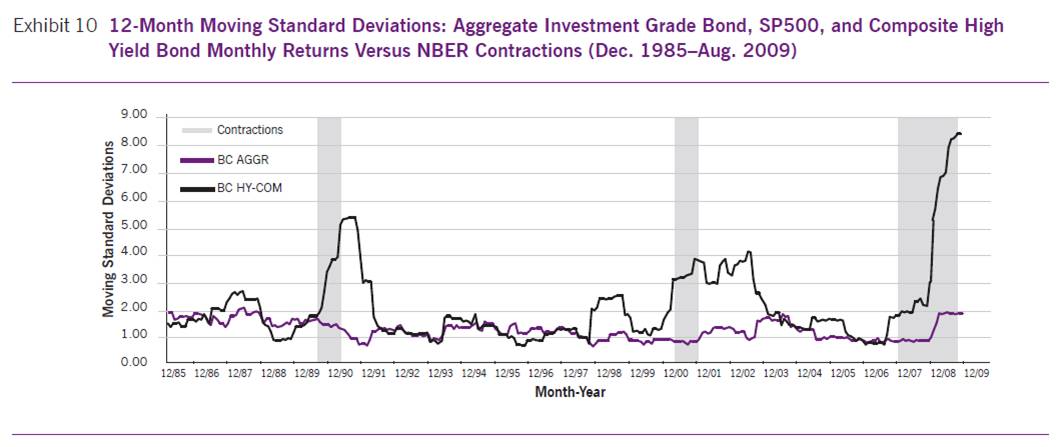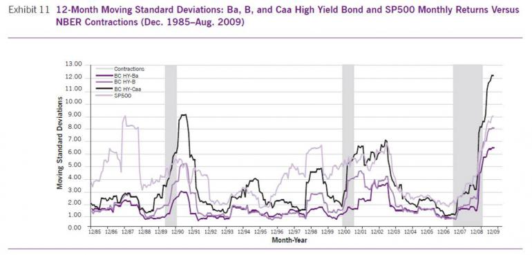 Bärenbulle Juli 8, 2012 · bearbeitet Juli 8, 2012 von Bärenbulle Diskutieren würde ich gerne mit Euch: Welche ETFs sind für das RK2 Musterdepot geeignet (mit Vor- und Nachteilen; ich werde nach und nach ein paar ETFs vorstellen) Sinnvolle Gewichtungen in einem Portfolio (z.B. gemessen am Korrelationsverhalten der Indizees) Sinnhaftigkeit einer solchen breiten Diversifikation (Wann liegt eine Überdiversifikation vor? Ist ein direktes Invest ohne ETF-Mantel sinnvoller? etc. etc.) Welche Renditeerwartungen haben die Assetklassen / Indizees? (Zusammentragen von historische Renditen der Indizees; sowie Diskussion zukünftiger langfristiger Trends) Nachdem Thema 1 nun weitgehend ergründet wurde, würde mich gerne als nächstes des Themas Nr. 4 widmen. Gefunden habe ich diesbzgl. folgendes lesenswerte Elaborat: Historic Changes in the High Yield Bond Market Das Dokument enthält Antworten zu viele interessanten Aspekte und folgende Grafiken: Der folgende Satz bringt das Renditeverhalten auf den Punkt: And thus, while the risk measures for rated HY bonds have all increased with lower bond ratings as expected, the average annual rates of return provided by the different classes of HY bond have been the complete opposite of expectations—with Ba-rated producing the highest average returns followed by B-rated bonds, and the Caa-rated bonds experiencing the lowest returns. Dies ist seltsam, denn die Risikoverteilung ist wie erwartet: "These differences between the risk of HY and IG bonds, and among the different ratings classes of HY bond, are also clearly reflected in differences in their cumulative default rates. As reported in Exhibit 6, the 10-year cumulative default rate for IG bonds has ranged from 0.5% for Aaa-rated bonds to 4.7% for Baa-rated bonds, with an overall average cumulative default rate for IG bonds of 2.1%. By contrast, the cumulative default rate for HY bonds has ranged from 17.4% for Ba-rated bonds to 52.2% for Caa-rated bonds, and an overall average cumulative default rate for HY bonds of 26.6%." As summarized in Exhibit 7, the strongest correlations are those among different IG bond series, correlations that have fallen within a narrow range from about 0.84 to 0.95. By contrast, the correlation between the S&P 500 and IG bonds has been low (0.206, and barely significant in a statistical sense), whereas the correlation between HY bonds and the S&P 500-HY bond has been considerably higher (.57), and statistically significant. The strongest correlation has been that between the returns on HY bonds and the returns on Russell 2000 small cap stocks (0.61). At the same, the returns on defaulted bonds have turned out to have no detectable correlation with any investment grade bond index, though strong (and significant) correlations with large-cap and small-cap stocks. Weniger schön ist zudem: ...the least volatile and highest correlations have been those between HY bonds and common stocks (over 0.90 in late 2008). Hohe Sharpe Ratios sind trügerisch, denn HYs sind genau dann riskant, wenn man es am wenigsten gebrauchen kann: During normal or “non-crisis” periods, the volatility of IG and HY bonds, as can be seen in Exhibit 10, is fairly similar and stable at 1-2%. In sharp contrast, the HY bond market experienced an explosion in volatility during periods of economic uncertainty—over 5% in 1991, about 4% in 2002, and over 8% in 2009. This pattern not only confirms the common perception that HY bonds are riskier than IG bonds based upon measures of volatility over long time periods, but also demonstrates that virtually all of the difference in risk shows up during periods of economic and political uncertainty. Diesen Beitrag teilen Link zum Beitrag