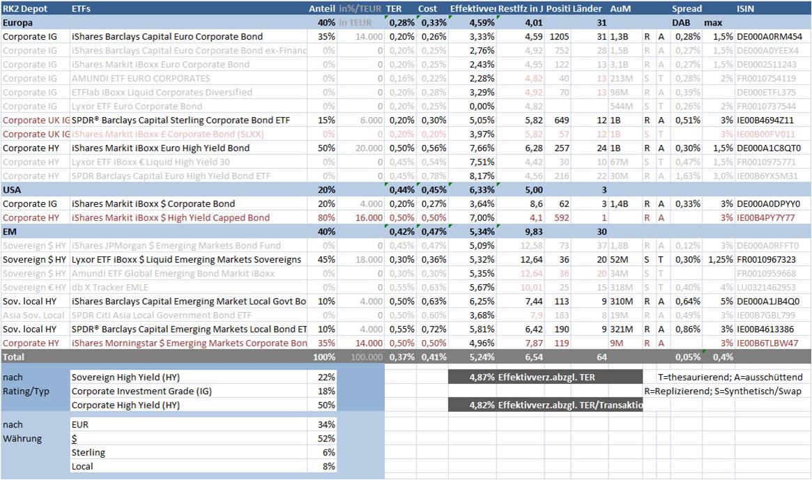 Noob1981 Juli 9, 2012 Will man alle hier vorgestellten Assetklassen integrieren, dann könnte das gesamte RK2-Portfolio so aussehen: Die aus meiner Sicht präferierten ETFs sind in schwarzer Schrift dargestellt. Alternative ETFs sind grau. Rot sind diejenigen die zz. nur in London handelbar sind. Bzw. Schätzwerte. Die Transaktionskosten habe ich mit den realen Spreads bei der DAB Klick mich (Spread einfach ermittelbar via Austausch ISIN im Link) ermittelt. Annahme ist eine Anlage (Umlage der Spreadkosten) von 5 Jahren. jetzt nochmal eine "Laienfrage": gibt es aktuell irgendwo kostenfreie Sparplanangebote auf diese ETFs? Bislang habe ich in mein ETF Depot per Einmalzahlung investiert. Aber gerade das traue ich mich beim jetzigen Marktumfeld nicht und würde hier lieber über Sparpläne langsam entsprechende Positionen aufbauen Diesen Beitrag teilen Link zum Beitrag