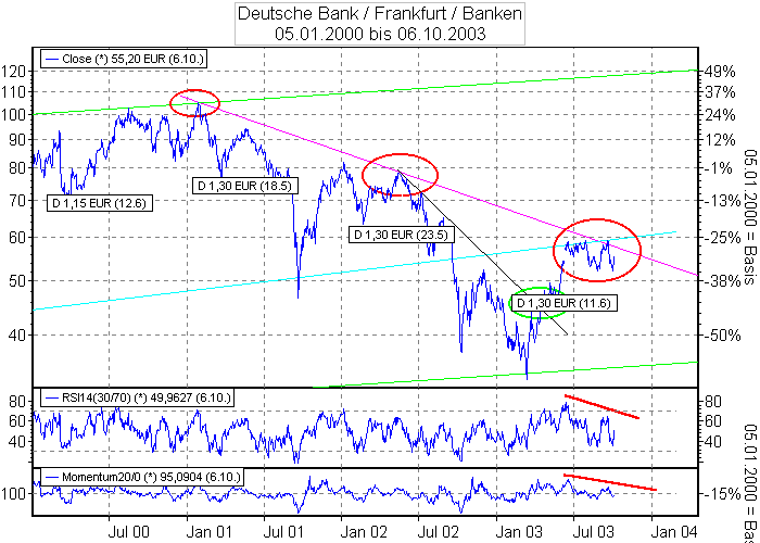 Aktiencrash Oktober 7, 2003 Jetzt wird es spannend bei der Deutschen Bank Aktie !!! Wieder einmal am Abwärtstrend angekommen, wieder einmal negative Divergenzen bei RSI und Momentum (rote Linie). Eigentlich ein Vorbote für fallende Kurse. Diesen Beitrag teilen Link zum Beitrag