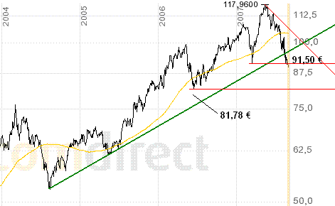 FrankY August 30, 2007 Die Charties steigen dann wohl auch noch aus 30.08.2007 - 14:20 Uhr Deutsche Bank bei 90,50 Euro aussteigen München (aktiencheck.de AG) - Die Experten von "FOCUS-MONEY" empfehlen um 90,50 Euro bei der Aktie der Deutschen Bank (ISIN DE0005140008/ WKN 514000) auszusteigen. Werbung Der Aktienkurs treffe im gefährlich spitzen Winkel von oben auf die Unterstützung um 94 Euro, wo auch der längerfristige aufwärts gerichtete Trend verlaufe. Wenn der Kurs nach unten durchbreche, betrage das Abwärtspotenzial rund 13 Prozent, bis die nächste Unterstützung bei 82 Euro erreicht sei. Die Experten von "FOCUS-MONEY" raten Technikern schon bei Kursen um 90,50 Euro aus der Deutschen Bank-Aktie auszusteigen. (Ausgabe 36) (30.08.2007/ac/a/d)Analyse-Datum: 30.08.2007 Diesen Beitrag teilen Link zum Beitrag