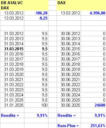 John Silver März 13, 2012 Warum nimmst Du nicht die Anleihe A1ALVC der Deutschen Bank bzw. generell Anleihen statt Aktien? Die bieten die gleiche Aufregung wie eine Aktienanlage, das hat Griechenland gerade eindrucksvoll bewiesen. Die A1ALVC ist zwar nicht vollkommen sicher (siehe Thread dazu, ACHTUNG! RISIKO!), aber immerhin noch im Rang vor den Aktionären angesiedelt. Mit der kommst Du aktuell auf eine Rendite von 9,91% p.a. . Und ich persönlich halte sie für besser als E.ON und lukrativer. Der vergleich hinkt ein wenig - aber guck mal was der DAX an Punkten machen muss, um die gleiche Rendite zu erzielen (die 0,25% sind angenommene Gebühren): Diesen Beitrag teilen Link zum Beitrag