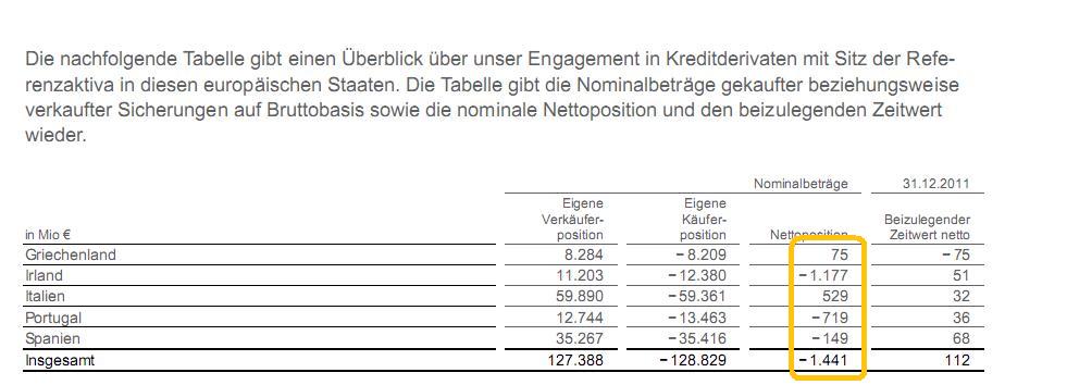 otto03 März 20, 2012 Außerordentlicher Gewinn durch Triggerung der Griechenland CDS? Die Deutsche Bank hatte bekanntlich am Anfang der Krise ihre Positionen mit CDS abgesichert, nachdem der Bundesregierung das Versprechen gegeben wurde die griechischen Anleihen nicht zuverkaufen. Die griechischen Anleihen wurden dann über die Zeit mehrmals abgeschrieben. Sollte daher die Auszahlung der CDS jetzt nicht einen Gewinn auslösen? Quelle Handelsblatt Deutsche Bank CDS gekauft (protection buyer): 4,324 Milliarden Euro CDS verkauft (protection seller): 4,420 Milliarden Euro Summe: - 96 Millionen Euro Quelle: European Banking Authority (EBA) Diesen Beitrag teilen Link zum Beitrag