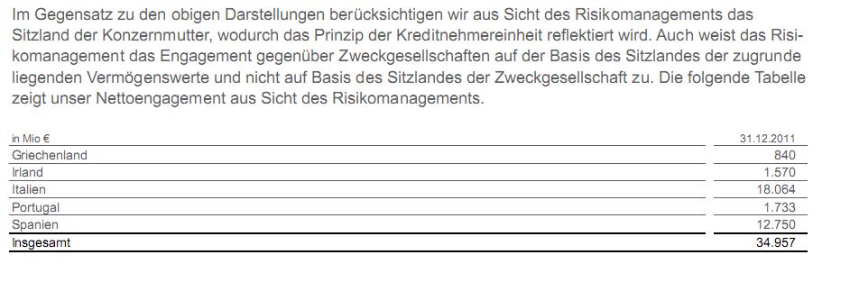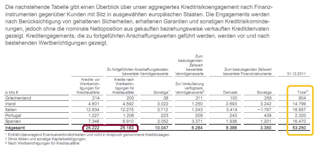 Kairos Mai 23, 2012 Hallo zusammen, ich würde gerne wissen welche Kreditrisiken bei der Deutschen Bank bzgl. der EURO Risikoländern bestehen. Im GB 2011 habe ich dazu folgende Informationen gefunden: Kreditvolumen aufgeteilt nach Länder und Kreditnehmertyp unter Berücksichtigung von Engagements in Kreditderivaten ergibt sich dann letzendlich Nun meine Verständnisfragen: 1. Verstehe ich es richtig, dass im Geschäftsjahr 2011 knapp 1 Mrd an Krediten abgeschrieben wurden? 2. Spielen Griechenland und Portugal nicht nur eine untergeordnete Rolle im Vergleich zu den anderen Ländern? Darüberhinaus beziehen sich 40 - 60 % der Forderungen auf Unternehmen, die bei einem Schuldenschnitt erst einmal nicht gleich wertlos verfallen (Probleme der einzelnen Unternehmen zur Schuldentilgung einmal außen vor). Desweiterne findet sich noch die folgende Tabelle im GB, in dem das Kreditvolumen für Irland noch einmal stark reduziert ist: 3. Sind daher nicht nur Italien und Spanien Länder, die wirklich große Erdbeben bei der Deutschen Bank auslösen könnten, und das auch nur wenn neben dem Staat auch die Unternehmenskredite voll betroffen sind? Diesen Beitrag teilen Link zum Beitrag