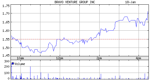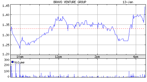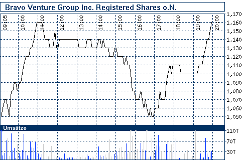 Risiko Januar 11, 2006 Heute ist Bravo Venture Group um 5 Cent gestiegen das ist aber noch nicht alles, der Chart ist ist mit Kurs Richtung Norden und die GMX in Toronto läuft gut mit. Diesen Beitrag teilen Link zum Beitrag