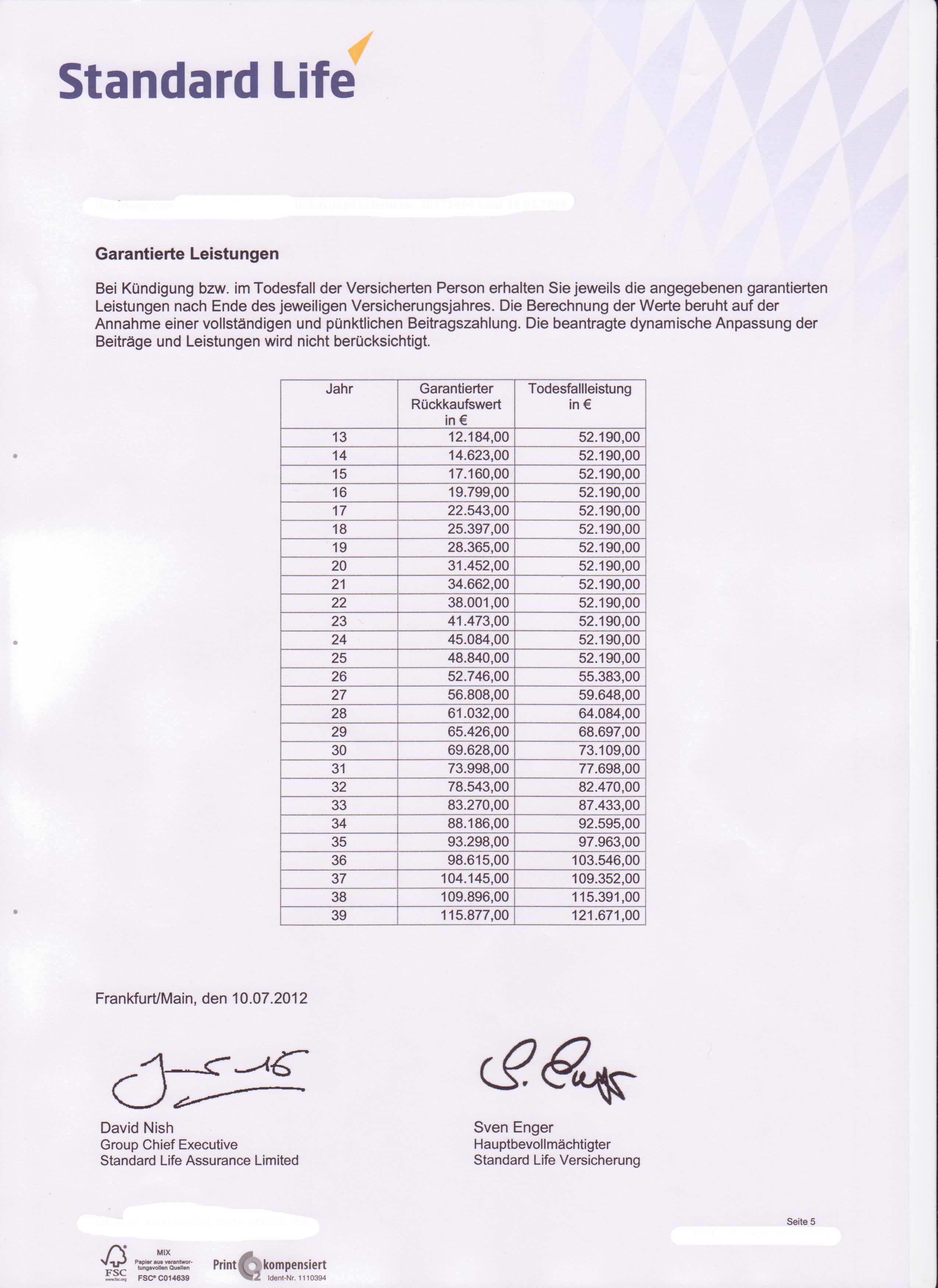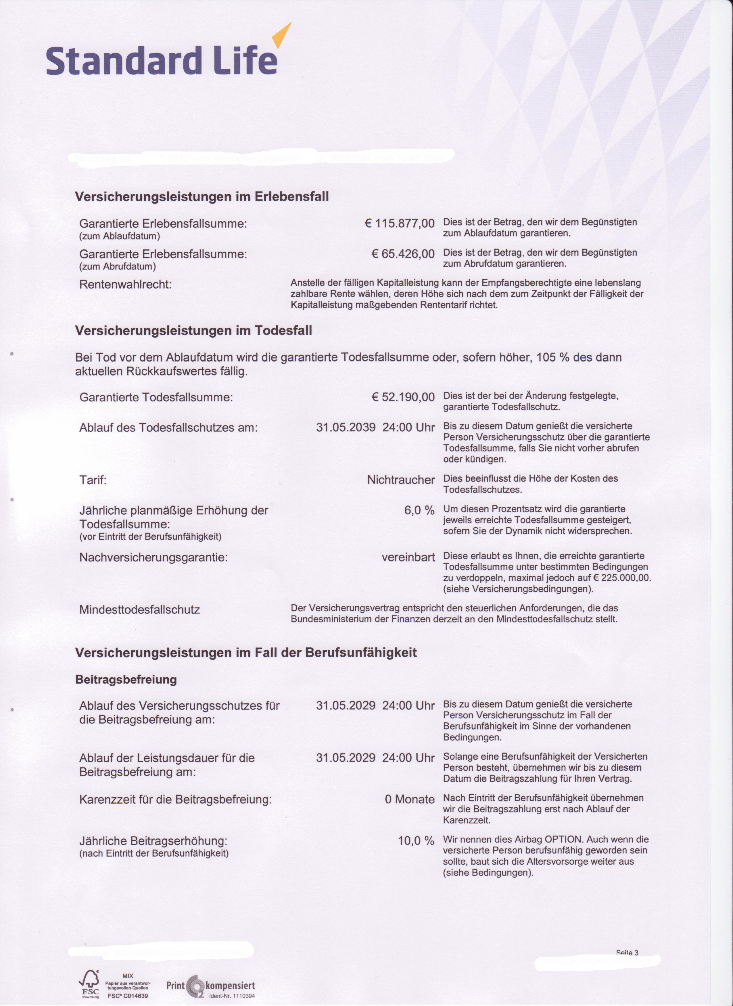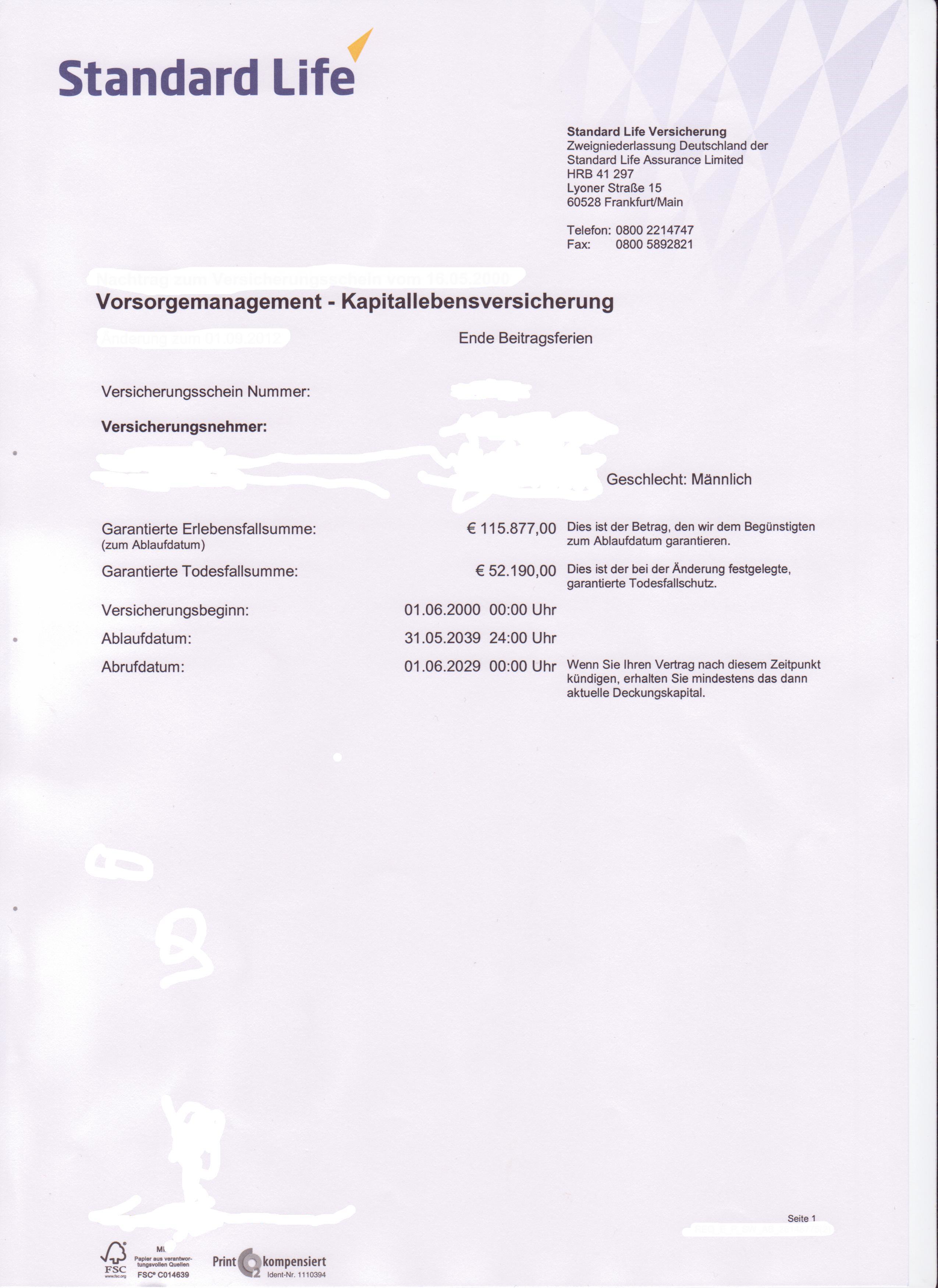 tomrossi August 10, 2012 Hallo, ich hab an das Forum folgende Fragen und ich hoffe Ihr könnt mir da, wie schon so oft, helfen. Also im Anhang angehängte Kapitalleben von Standard Life wurde mir damals von MLP empfohlen, da dies die letzte Chance ist steuerfrei so eine Versicherung unter Dach und Fach zu bringen. Die Versicherung wurde nach einiger Zeit beitragsfrei gestellt, da ich das Geld- anderweitig brauchte. Nun nach 2 Jahre soll diese wieder reaktieviert werden, Beitragsfreistellung das geht scheinbar nur 2 Jahre. Nachdem ich jetzt auf anraten meines jetzigen Beraters die Versicherung gekündigt hatte (die Rendite wäre zu schlecht), bekam ich einen Anruf von SL, indem mir der nette Herr erklärte, das ich hier Geld verbrenne, da ich ja die letzten ca 10 Jahre meine Gebühren für die restliche Laufzweit schon gezahlt hätte (ca. 6000 Euro) und ich einen Wiederverkaufswert von nur 10500 Euro zu erwarten hätte. Er riet mir mit dem Mindestbeitrag von 50 Euro weiterzufahren. Vorallendingen diese Art von Vertrag sollte ich doch behütten (steuerfrei), auf meine Frage hin, ob er mir garantieren kann, das das in Zukunft auch so sein wird, hatte er nartürlich keine Antwort, wie auch, weiß ja keiner. Ich weiß jetzt nicht was ich machen soll, kündigen oder mit 50 Euro weiterfahren? Hoffe auf den entscheidenden Tip von Euch. Grüsse aus Bayern Diesen Beitrag teilen Link zum Beitrag