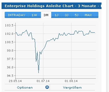 Stift März 18, 2015 Die Angebotsfrist für die neue Unternehmensanleihe 2015/2020 (ISIN: DE000A1ZWPT5) der Enterprise Holdings Limited beginnt am Donnerstag, 19. März 2015 und endet voraussichtlich am Donnerstag, 26. März 2015 um 16:00 Uhr (vorzeitige Schließung vorbehalten). Die neuen Schuldverschreibungen mit einer Laufzeit von fünf Jahren haben ein Volumen von bis zu 85 Mio. Euro und werden jährlich mit 7,00% verzinst. Davon sind bis zu 35 Mio. Euro für ein gleichzeitig stattfindendes Umtauschangebot reserviert. Inhaber der im September 2012 emittierten und 2017 fälligen Anleihe ( ISIN: DE000A1G9AQ4 ) können diese ebenfalls ab Donnerstag, 19. März bis einschließlich 26.März 2015 im Verhältnis 1:1 in neue Anleihen umtauschen und erhalten zudem je Anleihe eine Barzahlung in Höhe von 20 Euro je nominal 1.000 Euro, was einem Veräußerungspreis von 102% entspricht. onvista.de/news Diesen Beitrag teilen Link zum Beitrag