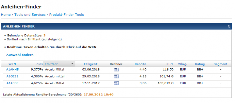 otto03 September 27, 2012 · bearbeitet September 27, 2012 von otto03 Es ist keine Anleihe, sondern ein Zertifikat. Das Volumen mit 2.0 Millionen ist viel zu gering für einen vernünftigen Handel. Wenn man kauft, sollte man also nicht mit Verkaufsmöglichkeiten zu vernünftigen Preisen rechnen. Der Handel mit Zertifikaten findet fast ausschließlich mit dem Liquiditätsgeber "Emittent" statt, Liquidität/Handel sollte daher unter normalen Umständen kein Problem sein. http://www.scoach.de/de/diverse-produkte/anleihe-auf-bonitt-arcelormittal-landesbank-berlin-girozentrale-london-branch-DE000LBB1KT8 Diesen Beitrag teilen Link zum Beitrag