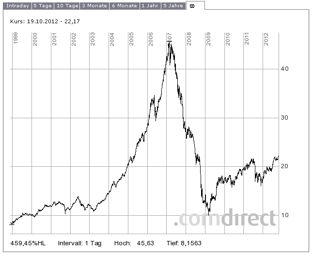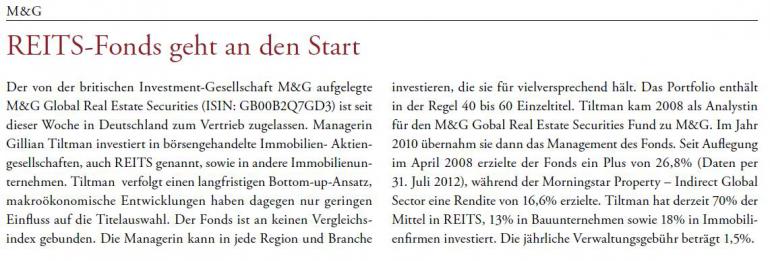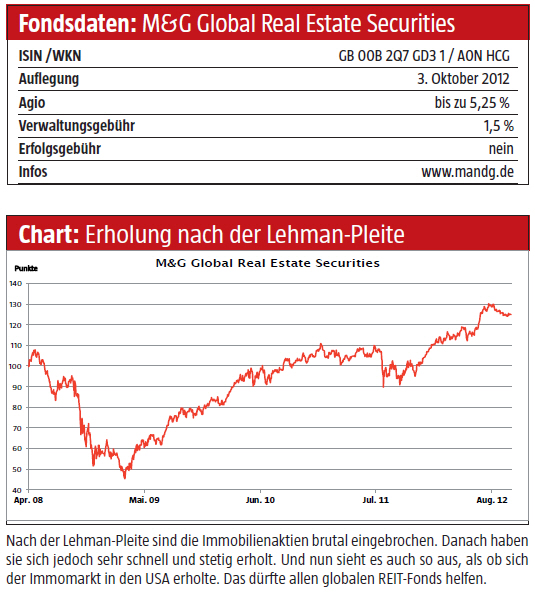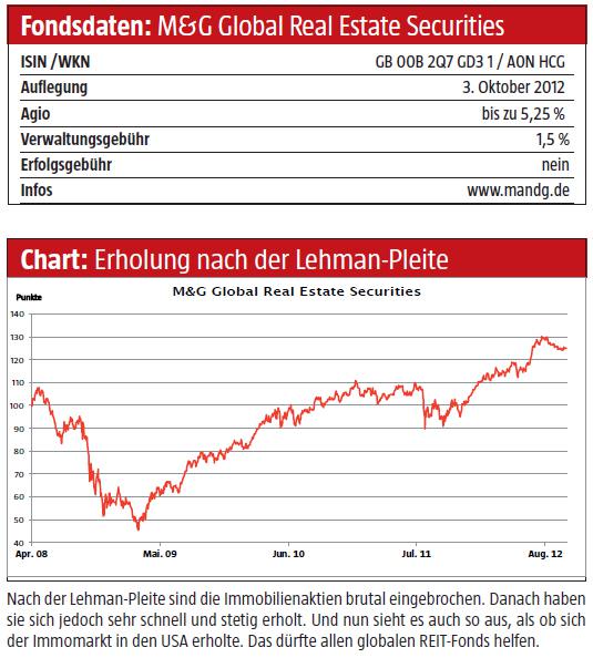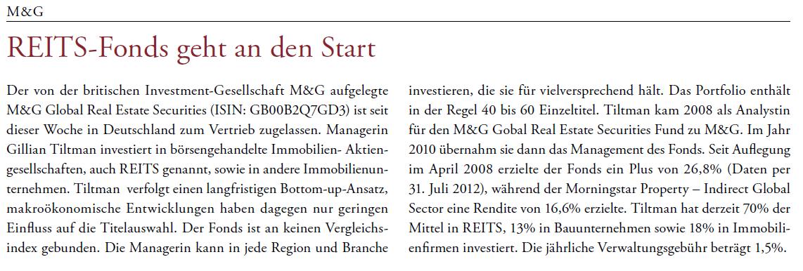 ghost_69 Oktober 21, 2012 M&G Gobal Real Estate Securities Fund Mehr habe ich bisher dazu nicht gefunden, bin mal gespannt was sich daraus entwickelt. Real-Estate-Investment-Trust = REIT = Immobilien-Aktiengesellschaft mit börsennotierten Anteilen Also sind es nichts anderes als Immobilienaktien. Bekanntlich liefen diese Dinger bei niedrigen Zinsen recht gut, sofern die Gesellschaften dann damit verdient haben. Achtung Aufpassen ! Hier von einem anderen Fonds der Chart: So ein Investment kann sich lohnen, genau wie jedes andere auch. Ich bin mal gespannt, wie sich er Fonds von M&G entwickelt und was sie anders machen als die anderen. Ghost_69 :- Diesen Beitrag teilen Link zum Beitrag