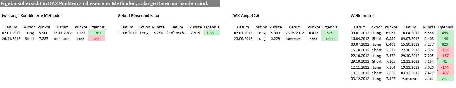 Onassis Dezember 23, 2012 Und hier eine Übersicht der GuV der vier oben gezeigten mittel- und langfristigen Methoden. Am besten zu Handeln mit Indexzertifikaten (langfristige Methoden) und leicht gehebelte Hebelzertifikate (Hebel max. 3) für die mittelfristigen Methoden. Die laufenden trades sind klein und kursiv geschrieben. Onassis Diesen Beitrag teilen Link zum Beitrag