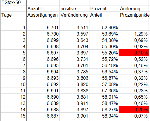 otto03 Dezember 23, 2012 · bearbeitet Dezember 23, 2012 von otto03 @Sthenelos, danke für die Antwort @Onassis, unabhängig von deinem Posting bezüglich "Short" komme ich als "Unwissender" zu durchaus vergleichbaren Ergebnissen Was ich mit dem Ausblenden des täglichen Rauschens meine, zeige ich anhand einer schnellen Untersuchung der Entwicklung des dividendenlosen EStoxx50 (Price) Index innerhalb von 15 Handelstagen seit Bestehen des Index. Wie man unschwer erkennt wächst der prozentuale Anteil der positiven Entwicklung des Index (mit kleineren Unterbrechungen) mit der Länge des betrachteten Intervalls. Inwiefern sich ähnliche Phänomene bei anderen Indizes oder sogar bei Einzelwerten zeigen, ist mir nicht bekannt - könnte man aber sicherlich auch bei vorhandenen Daten schnell untersuchen.. Inwiefern man solche Daten in renditetragende Handelsstrategien umsetzen könnte, kann ich mangels know how bei diesem Thema auch nicht beurteilen. Mir als Laien scheint bei "Daytradern" das Übel darin zu liegen, daß zu schnell, zu oft - auf Grund von technischen Indikatoren bei mehrheitlich steigenden Werten im Verhältnis zu häufig "geshortet" wird. Letztendlich kann ich mangels Kenntnissen das ganze natürlich nicht beurteilen, aber mir scheint eine grundsätzliche long Positionierung und eine short Positionierung nur bei eindeutiger Datenlage aller Indikatoren und Parameter erfolgversprechender zu sein als die Gleichbehandlung positiver und negativer Signale. PS gleichzeitig long und short auf denselben oder vergleichbaren Basiswert (mit welchem Fachbegriff auch immer versehen) habe ich und werde ich übrigens nie verstehen. Diesen Beitrag teilen Link zum Beitrag