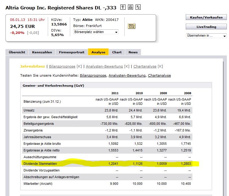 Onassis Januar 8, 2013 Die Zahlen passen bei Altria nicht. Zumindest EPS und Dividende sind anders. Altria schüttet z.B. 0,44 USD Quartalsdividende aus. Verlass Dich besser auf die Zahlen von den IR Seiten der Unternehmen. Danke, schinderhannes! Das Gefühl der "nicht passenden Zahlen" bekomme ich bei ausländischen Aktien auch immer mehr. Bei deutschen Unternehmen scheinen die Werte alle zu passen! Das wird eine Arbeit werden, alle ausländischen GBs und die Jahresübersichten an zu schauen und zu vergleichen. Aber sicher ist sicher - lieber mehr Arbeit und Zeit rein stecken als in das falsche Unternehmen zu investieren! Onassis Diesen Beitrag teilen Link zum Beitrag