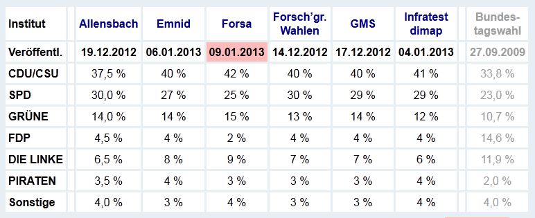 Onassis Januar 9, 2013 Hier die aktuelle Sonntagsfrage (http://www.wahlrecht...ragen/index.htm): Wenn die CDU noch ein bisschen mehr Gas gibt (kann gut sein, nachdem Steinbrück ein Fettnäpfchen nach dem anderen eröffnet) und die FDP die 5 Prozent klar überschreiten, dann kommt meine Lieblingszusammenstellung CDU+FDP zustande. Reicht die power in den nächsten neun Monaten nicht mehr aus, dann wird es wohl CDU + SPD geben = von den Bürgern gewollter politischer Stillstand in Deutschland! Onassis In 9 Tagen kann sich einiges verändern! Siehe aktuellste Forsa-Umfrage. Die FDP ist unter 2% gefallen - das hat sie wohl Röslers "Waschlappenrede" zu verdanken. Und die CDU ist mit 42% stärker als SPD+Grüne zusammen - wenn sie das halten könnte, wäre das für mich ein Traum! Onassis Diesen Beitrag teilen Link zum Beitrag
