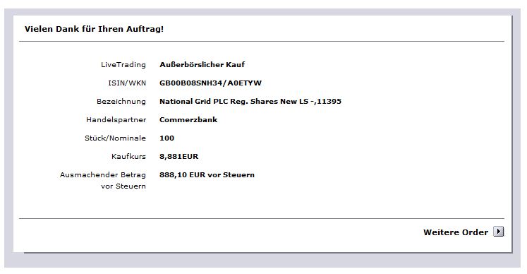 Onassis September 30, 2013 Wie letzte Woche angekündigt, habe ich soeben in der Mittagspause ein paar Aktien von National Grid in mein Depot einlagern lassen! http://www.nationalgrid.com/ http://de.wikipedia....i/National_Grid http://www.comdirect...TATION=12601956 Das war dann meine Oktober-Investition! Insgesamt liegen nun 14 Unternehmen im Depot mit insgesamt 33 Ausschüttungsterminen. Onassis Diesen Beitrag teilen Link zum Beitrag