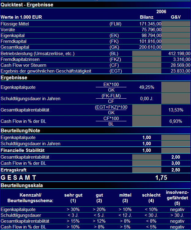 Toni April 28, 2007 · bearbeitet April 28, 2007 von Toni Danke Wayne für Deine Ausführungen! Hier die grobe Fundamentalanalyse auf Basis des Geschäftsberichts 2006 in Form des Quicktests: Alles in allem gute Zahlen, der Cash-Flow war allerdings etwas schwach. Dafür hat das Unternehmen eine überdurchschnittliche Eigenkapitalrendite und wenig Schulden. Alles in allem: gut. Chart: Schaut man sich den Chart über mehrere Jahre an, so fällt auf, dass der ca. 3,5-jährige Aufwärtstrend in den letzten Monaten gebrochen wurde: Es ist IMO durchaus wahrscheinlich, dass zunächst für einige Monate oder sogar ein ganzes Jahr eine Seitwärtsbewegung eintreten wird. Fazit: Da die Aktie niedrig bewertet ist, werde ich sie halten. Diesen Beitrag teilen Link zum Beitrag