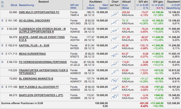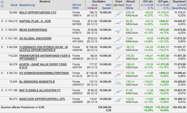 Hasenhirn Oktober 12, 2014 Huch! Da habe ich doch glatt das Quartalsende verpasst, ich Dussel. Mit Verspätung daher hier meine ungeduschten Superhasen, unverändert seit Januar 2013, diesmal aber sortiert nach Leistung. Der DWS-Dachfonds bleibt ein nach wie vor überraschend geheimer Geheimtipp, und die Jungs von Bantleon scheinen weiterhin in schwerer See zu navigieren: Immerhin noch +12,13% in etwa 21 Monaten; das macht dann so etwa fümpf bis zwölf Prozent pro Jahr oder so. Beim Grafen von Onvista sieht das letzte Quartal aber nicht so prickelnd aus: Na ja. Trotzdem muss das irgend so ein Lurch erst mal besser machen. Oder ein Tiger. Oder sonst wer. Traut sich einer? Grüße, H. Diesen Beitrag teilen Link zum Beitrag