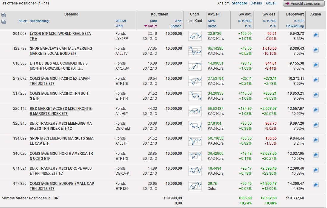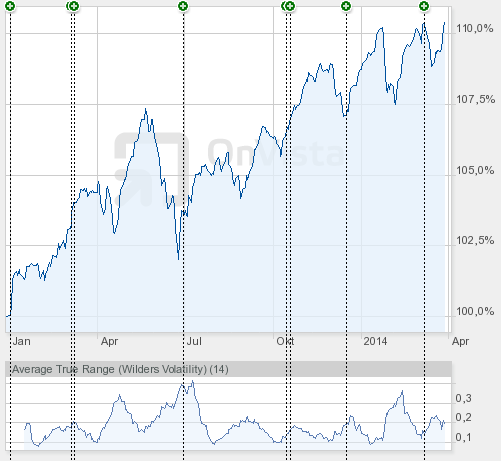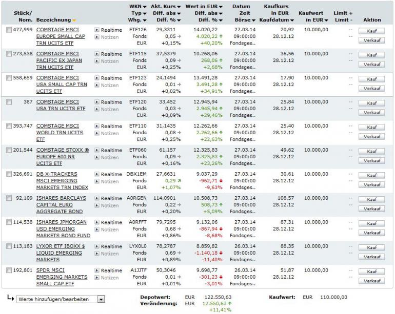 Hasenhirn März 30, 2014 Kurzes Update zum Quartalsende (gepostet mit einer verbrannten Bratwurst in der Hand, einer gegrillten Pomade im Haar, und leckerem Pantoffelsalat auf dem Schlips): Wie angedroht, haben meine Heldenhasen aus 2013 einfach mal in derselben Aufstellung weitergespielt und aus den 7.85% am Jahresende inzwischen 9.45% Wertzuwachs gemacht. Juhu! Annualisiert wären das gefühlte +7.5% p.a. Die Vola kann ich nicht ausrechnen, dafür bin ich zu faul und zu doof, aber als Trainer schaue ich ganz zufrieden auf den Kurvenverlauf, den Onvista malt: Na, wie sehen eure alten Mannschaften aus? Habt ihr die mal wieder angeschaut? H. Diesen Beitrag teilen Link zum Beitrag