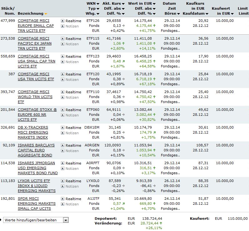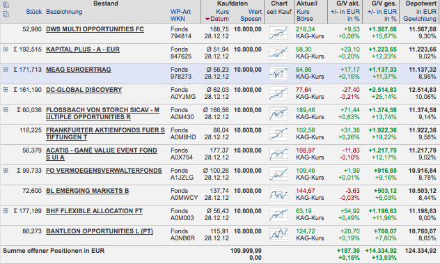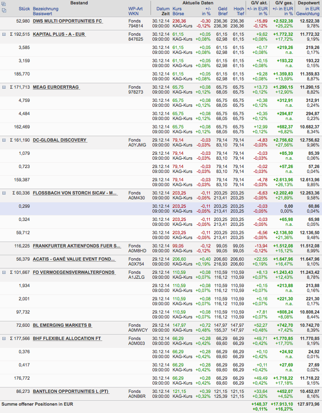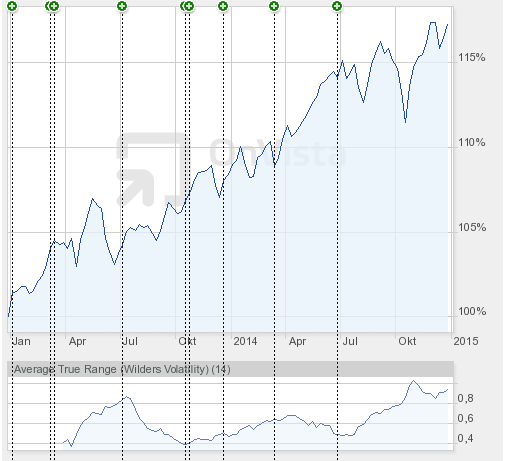 Hasenhirn Dezember 31, 2014 So seh'n Sieger aus! Allenfalls zweite Sieger. Echte lurchige Sieger sehen so aus Na gut. Der Lurch gewinnt die 2-Jahres-Saison mit +19,41% oder so. Spielverderber. Ich habe in meiner Verzweiflung noch einige Ausschüttungen aufgewischt und komme jetzt auf +16,27% meines ungeduschten (aber wohlriechenden) Hasenhaufens: Die Onvista-Volatilität (250 Tage?) liegt bei 4,05%, und der Wertverlauf sieht auch weiterhin gut aus: Hm, vielleicht lasse ich die Mannschaft auch 2015 unverändert. Die angestrebten 7 Prozent pro Jahr schaffen die Jungs bisher ja ganz gut... Wer hat noch einen Spielstand zu melden? Grüße, H. Diesen Beitrag teilen Link zum Beitrag
