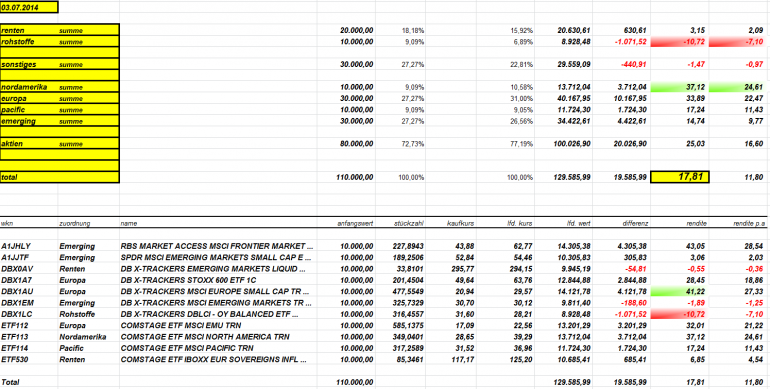vanity Juli 2, 2014 Aber ja doch: Sieht irgendwie ziemlich ähnlich aus und beweist eindrücklich, dass man seine Mannschaft auch ruhig mal zwischenduschen lassen kann, ohne wertvolle Prozentpunkte einzubüßen. Schön auch hier dargestellt, dass man seine Kicker gerne über das ganse Spielfeld verstreuen darf, statt dass sie sich nur im Mittelkreis zusammenrotten und dort den Rasen ruinieren. Ein einziger Edellurch hätte übrigens ausgereicht, um Rendite/Vola des gesamten Teams darzustellen (rot eingekringelt, der Deka iBoxx EUR Liqueur Souverän Lurchified 7-10 UCITS ETF, nicht im Kader). Solche effizienzsteigernden Maßnahmen sind aber leider durch das Regelwerk nicht gedeckt, da muss dringend was geschehen. Diesen Beitrag teilen Link zum Beitrag