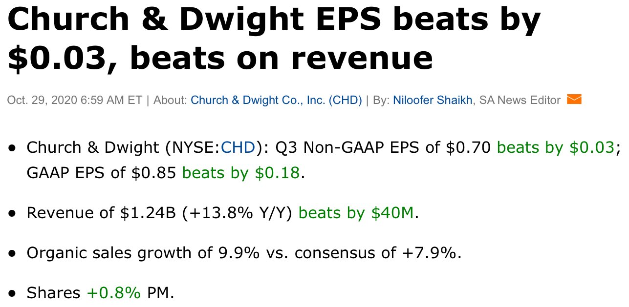 EWING, N.J. - (BUSINESS WIRE) - Jan. 29, 2021 - Church & Dwight Co., Inc. (NYSE: CHD) gab heute bekannt, dass der Gewinn je Aktie für das Gesamtjahr 2020 um 27,9% auf 3,12 USD je Aktie gestiegen ist. Das bereinigte EPS, das eine positive akquisitionsbedingte Earn-Out-Anpassung ausschließt, stieg um 14,6% auf 2,83 USD und übertraf damit den Ausblick des Unternehmens von 13% .
