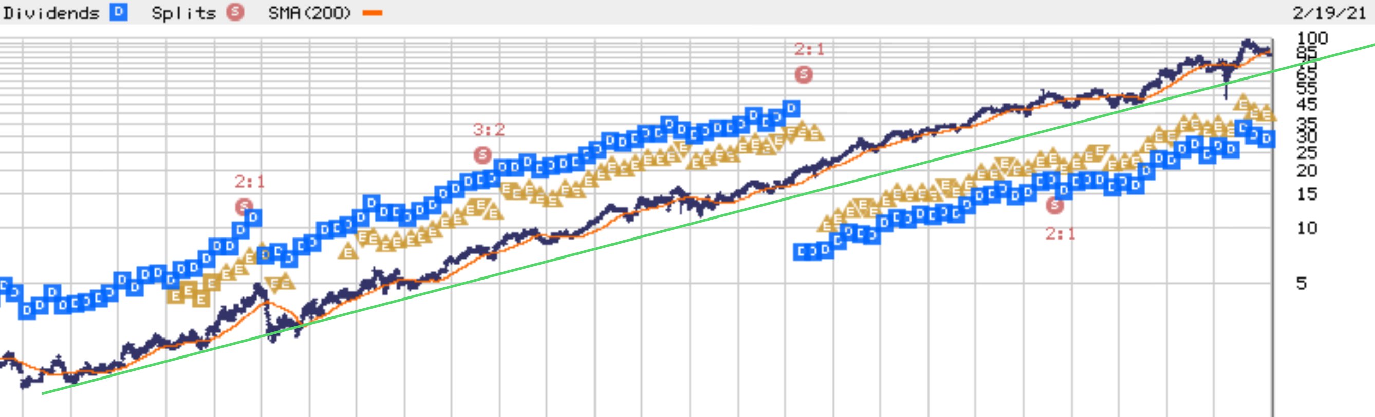 Interessant das sie laut FastGraphs also weiterhin überbewertet ist (dafür musste sie sonst bis knapp unter $70 korrigieren) aber hier eine so starke Unterstützung (basierend auf der Charttechnik) erfährt. Wenn man FG heranzieht lohnt sich ein Einstieg erst wieder wenn sie zumindest „fair“ bewertet ist du ein P/E von ca 22 erreicht. Das wäre aber erst bei einem Kurs von ca. $70 der Fall.