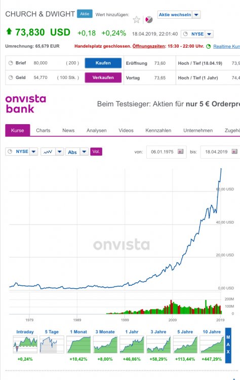 StefanU April 21, 2019 vor 39 Minuten von morini: Aus welchem Grund wird bei Onvista zur "Church & Dwight"-Aktie nicht der Kursverlauf von vor 2013 angezeigt, obwohl es diesen ja gibt, wie das Diagramm von Toni zeigt? Falschen Börsenplatz ausgewählt? Für die NYSE (man sollte ohnehin die Kurse der Heimatbörse nehmen) gehen die Daten bis 1975 zurück: Diesen Beitrag teilen Link zum Beitrag