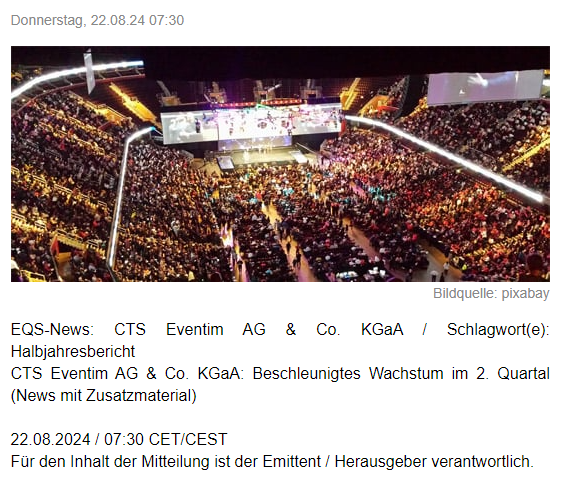ghost_69 August 22, 2024 EQS-News: CTS Eventim AG & Co. KGaA: Beschleunigtes Wachstum im 2. Quartal Zitat München, 22.08.2024 – Das Wachstum des CTS EVENTIM Konzerns hat sich im zweiten Quartal 2024 deutlich beschleunigt. Insbesondere die Entwicklung des Ticketing-Geschäfts bleibt positiv dynamisch. Darüber hinaus wurden im Juni erstmals die Zahlen der internationalen Unternehmensgruppe See Tickets und der im Zuge dieser Akquisition ebenfalls von Vivendi übernommenen Live-Aktivitäten konsolidiert. Neben dem traditionell starken Heimatmarkt Deutschland konnte auch die internationale Geschäftsentwicklung im zweiten Quartal wieder wichtige Impulse setzen. Im Segment Ticketing kamen drei der fünf meistverkauften Events aus dem europäischen Ausland und Südamerika, darunter der italienische Rap-Superstar Ultimo und die südamerikanischen Reggae-Stars Natiruts. Im Segment Live Entertainment kamen vier der Top5-Events aus dem Ausland, namentlich Bruce Springsteen in Spanien, Ultimo, Pinguini Tattici Nucleari und Max Pezzali in Italien. Mit Rock am Ring, Rock im Park, Hurricane, Southside und Nova Rock startete CTS EVENTIM erfolgreich in die diesjährige Festivalsaison. Auch die sehr guten Festival-Vorverkäufe für das kommende Jahr sind Zeichen einer weiterhin positiven Entwicklung. Die erfolgreichen Vorbereitungen für das Ticketing der Olympischen und Paralympischen Sommerspiele Paris 2024 gehörten im 2. Quartal zu den operativen Highlights und spiegelten sich anschließend in einem umfassenden Projekterfolg wieder. Auch 2026 und 2028 ist der CTS EVENTIM Konzern als offizieller Ticketing-Partner bei den Olympischen und Paralympischen Spielen engagiert. Der Bau der ARENA FOR MILAN, die nach Fertigstellung Italiens größte, innovativste und nachhaltigste Mehrzweck-Indoor-Arena sein wird, schreitet planmäßig voran. Die Vermarktung der Naming Rights sowie exklusiver VIP-Bereiche, inklusive privater Skyboxen, Lounges und anderer Exklusivflächen startet im Herbst. Konzern: Beschleunigtes Wachstum und höheres Adjusted EBITDA Der Konzernumsatz steigt im 2. Quartal 2024 um 21,2 Prozent gegenüber dem Vorjahreszeitraum auf 793,6 Millionen Euro. Sein Wachstum überflügelt das Wachstum im ersten Quartal in Höhe von 11,6 Prozent deutlich. Das Adjusted EBITDA des Konzerns wächst mit 23,3 Prozent noch dynamischer als der Umsatz und beträgt im 2. Quartal 110,0 Millionen. Auf die ersten sechs Monate gerechnet liegt der Konzernumsatz bei 1,202 Milliarden Euro (+ 17,7 Prozent) und das Adjusted EBITDA bei 202,2 Millionen Euro (+ 28,9 Prozent). Ticketing Im Segment Ticketing steigt der Umsatz im 2. Quartal um 28,5 Prozent auf 175,2 Millionen Euro. Das Adjusted EBITDA verzeichnet ein Plus von 35,1 Prozent auf 73,4 Millionen Euro. Auf das erste Halbjahr bezogen beträgt der Umsatz im Ticketing 358,0 Millionen Euro (+ 25,8 Prozent) und das Adjusted EBITDA 156,6 Millionen Euro (+ 29,5 Prozent). Live Entertainment Im Segment Live Entertainment verzeichnet der Umsatz im 2. Quartal ein Plus von 19,7 Prozent auf 631,1 Millionen Euro. Auch das Adjusted EBITDA legt um 5,0 Prozent auf 36,6 Millionen Euro zu. Für das gesamte erste Halbjahr beträgt der Umsatz im Live Entertainment 865,6 Millionen Euro (+ 15,2 Prozent) und das Adjusted EBITDA 45,6 Millionen Euro (+ 26,9 Prozent). Trotz des enormen Kostendrucks, der weiterhin auf der Branche lastet, konnte die Adjusted EBITDA-Marge in den ersten sechs Monaten des Jahres auf 5,3 Prozent verbessert werden, nach 4,8 Prozent im Vergleichszeitraum des Vorjahres. Ausblick Viele Sommershows, Open Airs, ebenso wie diverse Festivals finden im dritten Quartal statt und werden für weitere positive Impulse im Live Segment sorgen. Am umsatzstärksten ist im Ticketing traditionell das vierte Quartal, das besonders durch das Weihnachtsgeschäft und den Vorverkauf für zahlreiche Event-Highlights des Folgejahres geprägt ist. Vor dem Hintergrund eines starken ersten Halbjahrs und der Vollkonsolidierung der See Tickets Unternehmen ab Anfang Juni sieht der Vorstand die Geschäftsentwicklung auch der zweiten Jahreshälfte optimistisch. Für das Gesamtjahr 2024 rechnet er nun mit einem deutlich höheren Adjusted EBITDA im Vergleich zum Vorjahr. Klaus-Peter Schulenberg, CEO: „Wachstum und Ergebnis haben sich auch im 2. Quartal 2024 hervorragend entwickelt. Wie angekündigt, werden wir in diesem Jahr sowohl organisch als auch durch eine erfolgreiche Akquisition weiter wachsen. Mit See Tickets und den verbundenen Live Entertainment Aktivitäten konnten wir nicht nur unsere Marktposition in den Fokusmärkten UK und USA stärken, sondern auch unser Team um weitere hoch motivierte und ebenso qualifizierte Units vergrößern. In Kombination mit den erworbenen innovativen Technologien und Lösungen ist dies eine wertvolle Bereicherung für unser Unternehmen. Hierdurch bieten sich uns langfristig noch bessere internationale Entwicklungsmöglichkeiten.“ Über CTS EVENTIM CTS EVENTIM ist als Ticketing-Anbieter die Nummer eins in Europa und die Nummer zwei weltweit. Pro Jahr werden mehr als 300 Millionen Tickets über die Systeme des Unternehmens vermarktet – stationär, online und mobil. Laut dem „Global Promoter Ranking 2023“ von Pollstar ist die Gruppe der zweitgrößte Veranstalter der Welt. Darüber hinaus betreibt CTS EVENTIM einige der renommiertesten Veranstaltungsstätten Europas. Die CTS Eventim AG & Co. KGaA (ISIN DE 0005470306) ist seit 2000 börsennotiert und Mitglied des MDAX. Der Konzern erwirtschaftete 2023 in mehr als 25 Ländern einen Umsatz von 2,4 Mrd. Euro. Pressekontakt Christian Colmorgen Vice President Corporate Communications Christian.colmorgen@eventim.de Investor Relations Marco Haeckermann Vice President Corporate Development & Strategy marco.haeckermann@eventim.de Zusatzmaterial zur Meldung: Datei: KENNZAHLEN Q2 6M 2024 22.08.2024 CET/CEST Veröffentlichung einer Corporate News/Finanznachricht, übermittelt durch EQS News - ein Service der EQS Gro