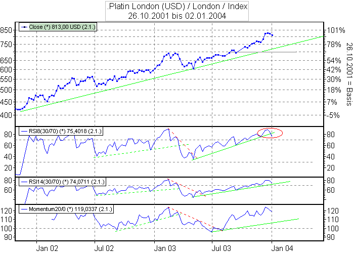 Aktiencrash Januar 4, 2004 Aufpassen denke ich sollte man jetzt gerade schon bei Platin ist meine Meinung. Wochenchartanalyse: Der RSI 8 ist durch die pos. Konvergenz (grün) gebrochen (roter Kreis). Beide RSI-Indikatoren befinden sich im überkauften Bereich. Da das Momentum sehr hoch steht, gehe ich mal von einer Seitwärtsbewegung aus bei Platin. Platin könnte von einem steigenden Dollar profitieren in dieser Phase. Bis zum jetzigen Aufwärtstrend besteht noch genug Platz. Diesen Beitrag teilen Link zum Beitrag