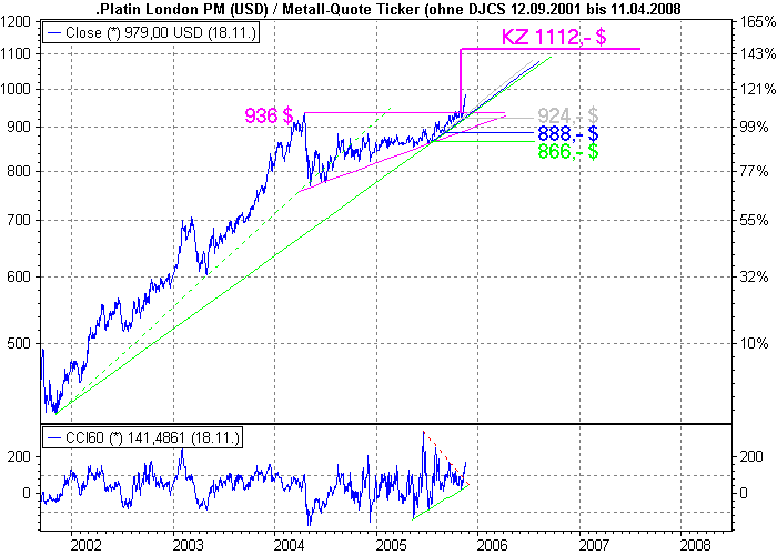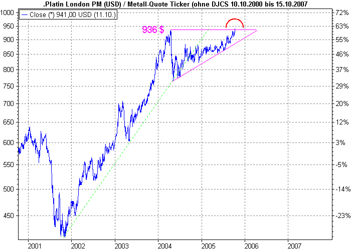 Aktiencrash November 19, 2005 Platin will offensichtlich das aufsteigende Dreieck nach oben verlassen (roter Halbkreis). Für Rohstoff-Fans könnte es hier interessant werden.Die Konsolidierung hat 1 1/2 Jahre angedauert und verlief sehr langweilig. Ich denke das man noch abwarten sollte ob die 950 $ geknackt werden. Da geht die Post ab bei Platin. Der Ausbruch ist dynamisch und sollte sich weiterhin fortsetzten ! Horiz. Unterstützungen: 924,- $ 888,- $ 866,- $ Das erste KZ sollte laut dem Dreieck 1112 betragen. Diesen Beitrag teilen Link zum Beitrag
