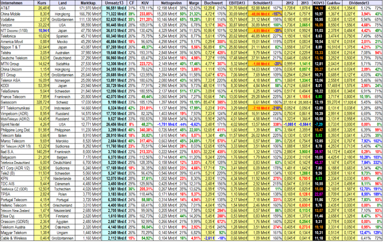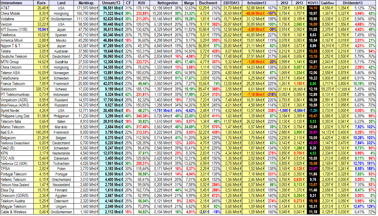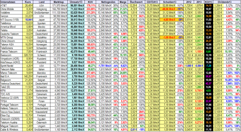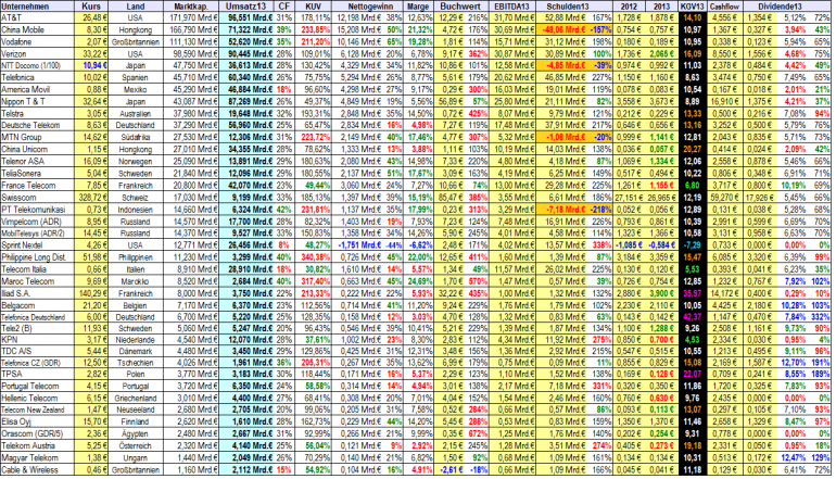 Karl Napf Februar 10, 2013 Nach dem Vorbild der Branchenübersicht zu den Stromversorgern habe ich eine entsprechende Tabelle auch für die Telekom-Unternehmen aufgebaut. Gegenüber den Stromversorgern habe ich zwei zusätzliche Spalten eingebaut: Den Prozentsatz, den der Nettogewinn vom EBITDA ausmacht (damit man sieht, wie sehr Zinsen und Abschreibungen auf dem Gewinn lasten) Den Prozentsatz, den die Dividendenausschüttung vom Nettogewinn ausmacht (damit man sieht, ob das Unternehmen durch diese Ausschüttung Substanz verbrennt - die entsprechenden Werte sind blau hervorgehoben) Sortiert habe ich die Tabelle diesmal nach Marktkapitalisierung, weil der Umsatz aufgrund der stark unterschiedlichen Nettomargen relativ wenig über ein Unternehmen besagt. Keine Kennzahlen gefunden für Airtel (Indien), Oi (Brasilien), Turkcell und TurkTelekom. Indische Telecoms hierzulande nicht handelbar außer Mischkonzernen. Hutchison Whampoa, Bouygues und Vivendi als Mischkonzerne nicht aufgenommen. Bei der NTT Docomo habe ich die Werte für 1/100 Aktie verwendet. Eine normale Aktie kostet derzeit 1094 €, alle abgeleiteten Werte sind zwei Stellen größer als bei den übrigen Titeln dieser Liste und hätten mir das Layout in der Breite gesprengt. Alle Zahlen stammen aus dem ComDirekt-Informer; die Umrechnung aus der jeweiligen Landeswährung habe ich selbst aufgrund aktueller Crossrates vorgenommen. Die Tabelle kann also zweifach fehlerbehaftet sein, insofern empfehle ich dringend eine Überprüfung im Einzelfall. Der Erkenntnisgewinn für mich selbst bei dieser Tabelle liegt vor allem im afrikanischen Markt. Maroc Telecom (eine Tochtergesellschaft von Vivendi) kannte ich, hätte ich aber kleiner geschätzt; die MTN Group kannte ich nicht, und bei dieser Größe und angeblicher Schuldenfreiheit scheint sie mir eine nähere Untersuchung wert zu sein, da sie zumindest international gut diversifiziert erscheint und der Suchbegriff "MTN" im Aktien-Unterforum bisher keinen einzigen Treffer liefert. Diesen Beitrag teilen Link zum Beitrag