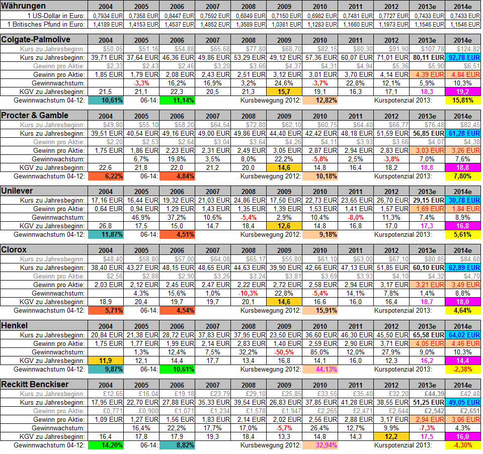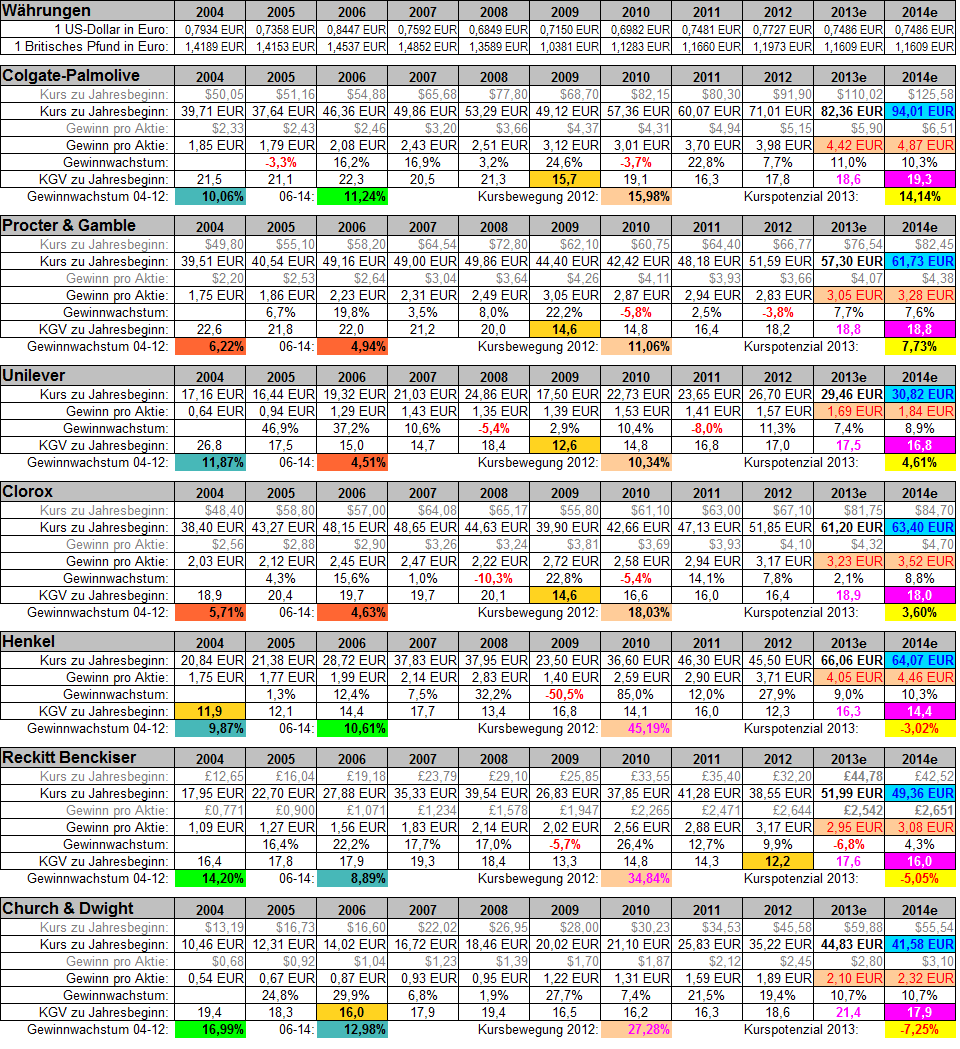 Karl Napf Februar 14, 2013 · bearbeitet Oktober 8, 2013 von Chemstudent Anlässlich der aktuellen Zahlen von Reckitt Benckiser habe ich mal versucht, mir einen Überblick über die vermutliche Peer Group des Unternehmens zu machen, um dessen Gewinnwachstum und KGV-Bewertung besser einschätzen zu können. Dabei haben mich die folgenden Fragestellungen angeleitet: Bieten die Unternehmen dieser Gruppe ein jährliches Wachstum des Gewinns pro Aktie in der Größenordnung von 10%? In welcher Relation stehen Gewinnwachstum und KGV zueinander? Ist das Gewinnwachstum über 10 Jahre hinweg stetig und stabil, oder ist in einer Wirtschaftskrise wie 2008/09 ein Einbruch erkennbar? Wie ist die aktuelle KGV-Bewertung der einzelnen Unternehmen im Vergleich zu ihrer historischen Durchschnittsbewertung? Um vergleichbare Werte zu erhalten, habe ich zwar die Daten aus den Geschäftsberichten in der jeweiligen Heimatwährung ermittelt, diese aber allesamt in Euro umgerechnet. Da ich für die KGV-Bewertung den ersten Aktienkurs des jeweiligen Kalenderjahres verwenden wollte, habe ich auch die Währungs-Crossrate zum selben Stichtag verwendet (was im Falle des Britischen Pfundes Anfang 2009 einen heftigen Zacken nach unten bedeutete, der aber an den mir wichtig erscheinenden Aussagen nichts ändert). Für das mittlere KGV habe ich die jeweils 10 einzelnen KGVs nicht addiert, sondern multipliziert und die 10. Wurzel daraus gezogen, was den Einfluss eines niedrigeren KGV etwa in einer Wirtschaftskrise gegenüber dem arithmetischen Mittel etwas abschwächt und mir deshalb realistischer erscheint. Die Aktienkurse der Spalte "2013e" sind nicht diejenigen vom Jahresbeginn, sondern die aktuellen, weil ich nur zu diesen die betreffende Aktie derzeit kaufen könnte. Die margentafarben hinterlegten Felder in der Spalte "2014e" sind jeweils der 10-Jahres-Durchschnitt für das KGV der betreffenden Aktie; der blau auf blau dargestellte Wert wäre derjenige Aktienkurs, der Anfang 2014 erreicht werden müsste, wenn erstens die in rot auf orange dargestellten Konsensschätzungen für die Jahre 2013e und 2014e exakt eintreffen sollten und zweitens die Aktie Anfang 2014 exakt mit ihrem Durchschnitts-KGV bewertet wäre. Die gelb hinterlegten Felder "Kurspotenzial 2013" zeigen die Kursbewegungen, die für diesen Fall bis Ende des laufenden Kalenderjahres erfolgen müssten; nach diesem Wert ist die Tabelle sortiert. Colgate-Palmolive hat derzeit ein KGV unter ihrem historischen Durchschnitt, was zusammen mit einem ordentlichen 2014er-Gewinnwachstum von 10,3% ein Kurspotenzial von 15,81% eröffnen würde. Reckitt Benckiser hingegen ist deutlich höher bewertet als mit seinem historischen Durchschnitt, und das zudem magere Gewinnwachstum in 2014e lässt einen Kursrückgang um 4,3% erwarten. Erstaunlich finde ich, dass kein einziger Titel aus dieser Gruppe über 10 Jahre hinweg eine lückenlose Historie von Gewinnanstiegen vorzeigen kann. Fünf der sechs Unternehmen haben zwei Rückschläge auf ihrer Agenda; der sechste Titel, nämlich Henkel, musste in der Krise 2009 sogar eine Halbierung seines Gewinns hinnehmen. Damit dürfte Henkel, dessen Klebstoffe wohl auch in der Automobilproduktion reichlich Verwendung finden, der zyklischste Titel dieser Gruppe sein, was das deutlich niedrigste KGV unter diesen Titeln rechtfertigt. Was das Verhältnis zwischen KGV und Gewinnwachstum betrifft, so habe ich dafür farbige Markierungen in den Spalten "2004" und "2006" verwendet. Ich habe bewusst zwei verschiedene Messverfahren eingesetzt, nämlich das Wachstum von 2004-2012 (wofür belastbare Bilanzdaten vorliegen) und das Wachstum von 2006-2014 (wofür Konsensschätzungen für die beiden kommenden Jahre Verwendung finden müssen), weil ich wissen wollte, bei welchen Unternehmen das Gewinnwachstum ggf. noch gesteigert werden kann bzw. sich derzeit abflacht. Ein rot hinterlegter Wert verfehlt das angestrebte Ziel von im Mittel 10% Gewinnwachstum beträchtlich, was ich sowohl bei Procter & Gamble als auch bei Clorox angesichts von KGVs um die 19 ziemlich enttäuschend finde. Hellgrün hinterlegte Werte erfüllen meine Wunschvorstellung, wobei die dunkel-türkisfarbene Markierung den Trend anzeigt: Colgate-Palmolive und Henkel schaffen tatsächlich eine leichte Steigerung des Gewinnwachstums, während Unilever die gigantischen Wachstumswerte aus den Jahren 2005 und 2006, die bei der zweiten Messmethode aus der Wertung gefallen sind, nicht beibehalten konnte. Bei Reckitt Benckiser soll der Gewinn in 2013 und 2014 nach Konsensschätzungen stagnieren, was der Bewertung des zuvor am stärksten wachsenden Unternehmens natürlich weh tut. Als Fazit bleibt bei mir der Eindruck zurück, dass keiner der sechs Werte derzeit wirklich günstig zu haben ist. Procter & Gamble sowie Clorox sind für ein mageres Gewinnwachstum von knapp 5% mit historischen und aktuellen KGVs von 18-20 m. E. viel zu teuer; für Unilever gilt dasselbe, wenn man die vergangenen 8 Jahre betrachtet. Bei einer Nestle bekommt man einfach mehr Wachstum fürs KGV. Henkel und Reckitt Benckiser wären Anfang 2012 mit einem KGV von jeweils 12 beide ein glasklarer Kauf gewesen - und beide Aktien sind im Kalenderjahr 2012 auch mit großem Abstand am besten gelaufen, beide sogar besser als der DAX. Colgate-Palmolive schließlich ist mit einem historischen KGV von 19.2 der teuerste Wert dieser Gruppe, kann aber mit dem höchsten und zudem noch leicht steigenden Gewinnwachstum sowie den geringsten negativen Ausreißern in seiner Gewinn-Historie punkten und sich seine Premium-Bewertung einigermaßen verdienen. Angesichts einer moderaten Kursbewegung in 2012 ist diese Aktie als einzige niedriger bewertet als ihr historischer Durchschnitt; ein KGV von 18.3 ist sicherlich nicht billig zu nennen, aber mit einer minimalen Bewertung von KGV 15.7 in der Krise 2009 zeigt dieses Unternehmen eine Robustheit, welche die Aktie als Buy&Hold-Position besonders auszeichnet. Direkt kaufen möchte ich derzeit k
