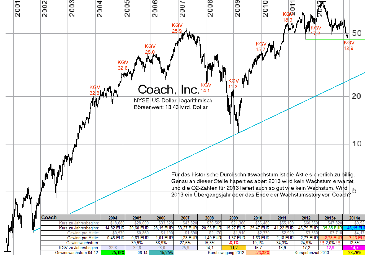 Matthias1980 Februar 24, 2013 · bearbeitet Februar 28, 2013 von Schinzilord Edit Edit by Schinzilord: COACH - ein US Lederwaren- und Textilhersteller Profil: Coach, Inc. ist ein US-amerikanischer Hersteller von Lederwaren. Der als Familienunternehmen gegründete Konzern produziert Handtaschen, Koffer, Geldbörsen sowie unterschiedliche Accessoires wie Gürtel, Sonnenbrillen, Schlüsselanhänger oder Schirme für Damen und Herren. Die Produkte des Konzerns werden in erster Linie in den USA und in Kanada in eigenen Coach-Läden verkauft, können aber auch über einen Online-Store bestellt werden. Der Konzern legt großen Wert auf qualitativ hochwertiges Material und die entsprechende Verarbeitung. In enger Zusammenarbeit mit externen Lizenzpartnern werden außerdem Uhren und Schuhe produziert. Heute umfasst das Sortiment neben Lederwaren auch Kleidung und Schmuck. Coach bringt außerdem jedes Jahr eine limitierte Sonderedition auf den Markt. Innerhalb dieser besonderen Kollektion werden zum Beispiel alte Trends wiederbelebt bzw. neu aufgelegt. Zudem bietet der Lederwarenfabrikant verschiedene Geschenkeditionen. Derzeit arbeitet Coach an der Ausweitung seiner Marktpräsenz und ist dafür verstärkt im asiatischen Raum aktiv. Kursverlauf Hier die Infos auf der Finance Yahoo Seite: klick mich Marktkap. 02/2013: 13,61Mrd. Unternehmenswert (28.02.2013): 12,59Mrd. Rollierendes KGV (ttm, Intraday): 13,35 Erwartetes KGV (JE 30.06.2014): 11,66 PEG-Ratio (5-Jahres-Erwartung): 0,95 Kurs/Verkäufe: 2,72 Kurs/Buch: 6,44 Unternehmenswert/Umsatz: 2,55 Unternehmenswert/EBITDA: 7,44 Hier die Bilanz Gewinn und Verlustrechnung Kapitalflussrechnung Besitzverhältnisse: Aufschlüsselung % von Aktien im Besitz von allen Insidern und 5%-Besitzern: 1% % von Aktien im Besitz von institutionellen Anlegern und Fonds: 92% % von Float im Besitz von institutionellen Anlegern und Fonds: 93% Anzahl institutioneller Anleger, die Aktien halten: 768 Ich habe ab hier Threads aus Onassis Queerbeets-Thread ausgelagert. Edit Ende Schinzilord Ab hier Originaltext by Matthias1980: Kurze Frage: Kennt sich jemand von euch genauer mit dem US-Lederwarenhersteller COACH (WKN: 566039) aus? Ich habe die Aktie auf meiner Watchlist gehabt, und sie ist in den letzten Wochen / Monaten von fast 80$ (Sommer 2012) auf aktuell 47$ gefallen. Die Gewinne und Umsätze wachsen wohl nicht mehr so stark, und das Weihnachtsgeschäft lief auch nicht so doll. Zusätzlich tritt Lew Frankfort als CEO zurück. Das aktuelle KGV mit dem 2012er Gewinn liegt bei 12,6. Das Verhältnis von Kurs zu den Owner Earnings beträgt 13,3. Ich werde in den nächsten Tagen mal die letzten Geschäftsberichte lesen um ein Gefühl für das Unternehmen zu bekommen Diesen Beitrag teilen Link zum Beitrag