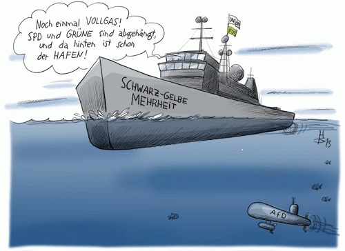 Wenn jetzt noch die verfolgende Rot Rot Grüne Flotte gezeigt werden würde, es hängt ja nur ein (!) Torpedo unter der AfD, dann wäre das wirklich perfekt, auch im Hinblick darauf, wer dann im Hafen ist. ... whistling.gif
