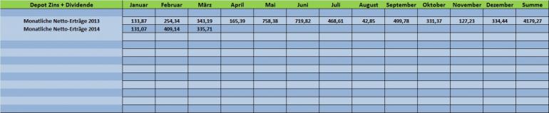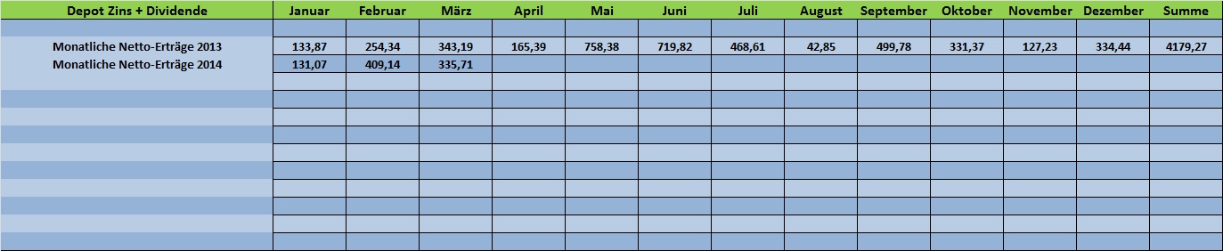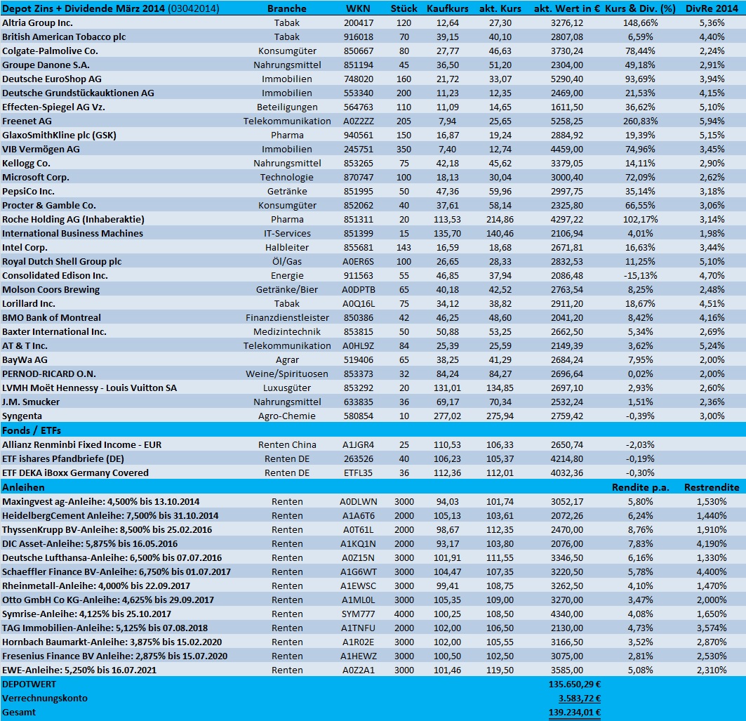 Tutti April 3, 2014 Anbei ein aktuelles Depot-Update für März 2014!! Kauf 10 Stück Syngenta-Aktien zu 277,02 € (incl.) und Kauf 36 Stück Deka ETF DE Jumbo Pfandbriefe zu 112,36 € (incl.) Verkauft wurde am 21.03.2014 mit einem Plus von ca. 10% der komplette Bestand an BP-Aktien. Ein Ölwert reicht mir im Moment völlig aus. Insgesamt bin ich mit der Depotentwicklung in 2014 und einer Performance von knapp +3% sehr zufrieden. Die Krimkrise hat das Depot gut überstanden und die Depot-Volatilität zeigt Onvista aktuell weiter mit niedrigen 6,32% an. Für die nächste Woche ist ein kleiner Depotumbau geplant. Ich werde vielleicht die beiden neuen Hybrid-Anleihen von EnBW und VW einbauen, sowie 1 oder 2 neue Aktienpositionen aufnehmen. Hierfür wird die 1k-Sparrate und eine Sonderzahlung von 2,5k verwendet, die neu auf das Verrechnungskonto gebucht wurden. Freenet, Roche und Microsoft machen weiter viel Freude. Bei Roche darf ich durch die März-Dividende einen neuen 100%er bekannt geben und Microsoft hat fast spielend die Hürde von 40 US$ genommen. AT&T hat ein neues Aktienrückkauf-Programm bekannt gegeben und mein Medizintechnik-Wert Baxter hat die Aufteilung des Konzerns in 2 eigene Sparten "Bio-Pharma" und "Medizintechnik" für 2015 verkündet. Die Kurse zogen dementsprechend an. Dividenden-Erhöhungen gab es bei: Deutsche Euroshop (4,2%) VIB Vermögen (12,5%) Colgate-Palmolive (6%) Freenet (7,5%) - (Hier hatte ich bei der letzten Performance-Berechnung glatt die bisherigen Dividendenzahlungen unterschlagen) Dividenden-Zahlungen gab es von: Smucker, Intel, Lorillard, IBM, Roche, Microsoft, Molson Coors, ConEdison, Kellogg, Shell, BP und PepsiCo Kupon-Zahlungen gab es von: keine Diesen Beitrag teilen Link zum Beitrag