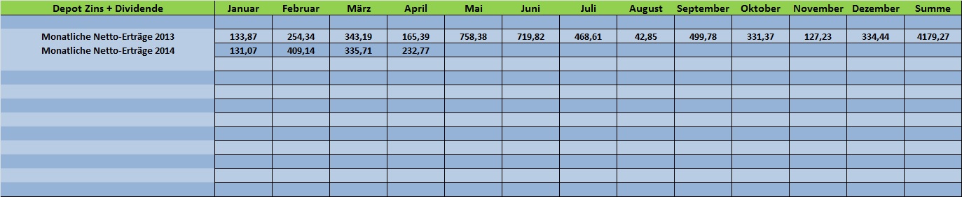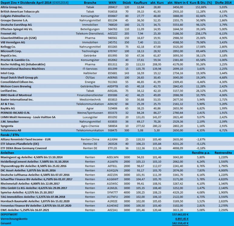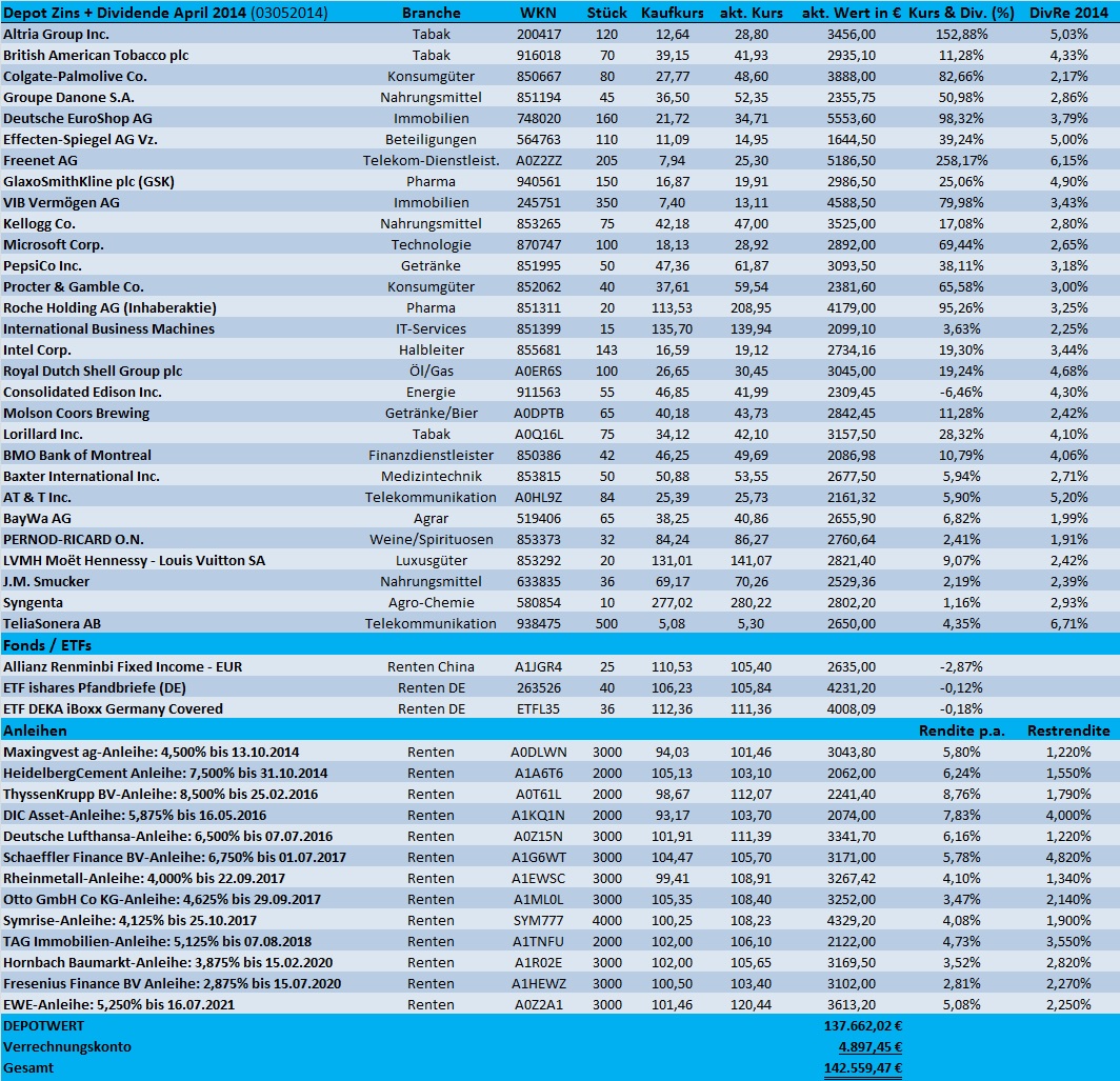 Tutti Mai 3, 2014 Anbei ein aktuelles Depot-Update für April 2014!! Kauf 500 Stück TeliaSonera AB zu 5,08 € (incl.) und dann letztlich doch Verkauf nach Dividendenkürzung: "Deutsche Grundstücksauktion AG" zu 10,73 €. Letztlich blieb hier nur wegen der Sonderdividende ein kleiner Ertrag übrig. Es gibt eigentlich zu jeder Position etwas zu berichten. Wenn es mir die Zeit erlaubt, verlinke ich aktuelle Nachrichten in den jeweiligen Themen-Threads. Das Depot konnte im April um 1,46% zulegen und die Gesamtperformance im Jahr 2014 beträgt zum 30.04.2014 jetzt 4,46%. Die Aktie meines US-Energieversorgers ConEdison hat sich im April jetzt sehr gut entwickelt und auch Royal Dutch Shell hat nach nicht ganz so schlimmen Zahlen und einer abermaligen Dividendenerhöhung sich sehr schön entwickelt. Auffällig ist auch die sehr gute Entwicklung der Tabakaktien, nach eher mäßigen Quartalszahlen. Mein Tabakwert "Lorillard" hat im April um knapp 10% zugelegt und hier rechne ich bald mit Neuigkeiten von Reynolds. Meine Neuerwerbung TeliaSonera AB ist vom Fleck weg auch gut gestartet. Diesen Wert sehe ich auch eher als Anleiheersatz. Neueinkäufe oder Aufstockungen sind auf jeden Fall geplant. Diese werde ich in nächster Zeit hier posten. Dividenden-Erhöhungen im April gab es bei: Kellogg Company (6,5%) Procter & Gamble (7%) Royal Dutch (4,4%) GSK (6,5%) Dividenden-Zahlungen gab es von: Baxter Int., Altria, GSK, LVMH Kupon-Zahlungen gab es von: HeidelbergCement, Deka-Pfandbrief-ETF Diesen Beitrag teilen Link zum Beitrag