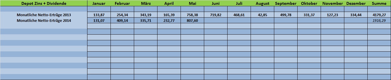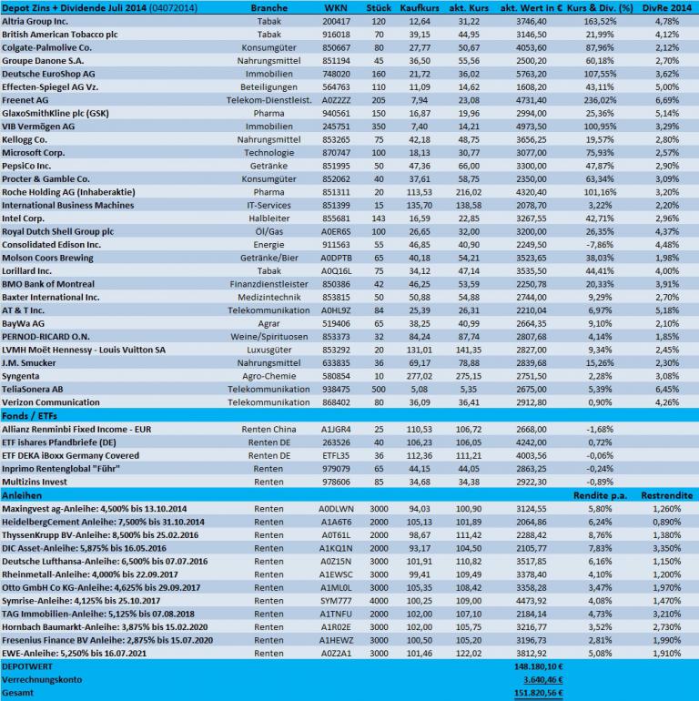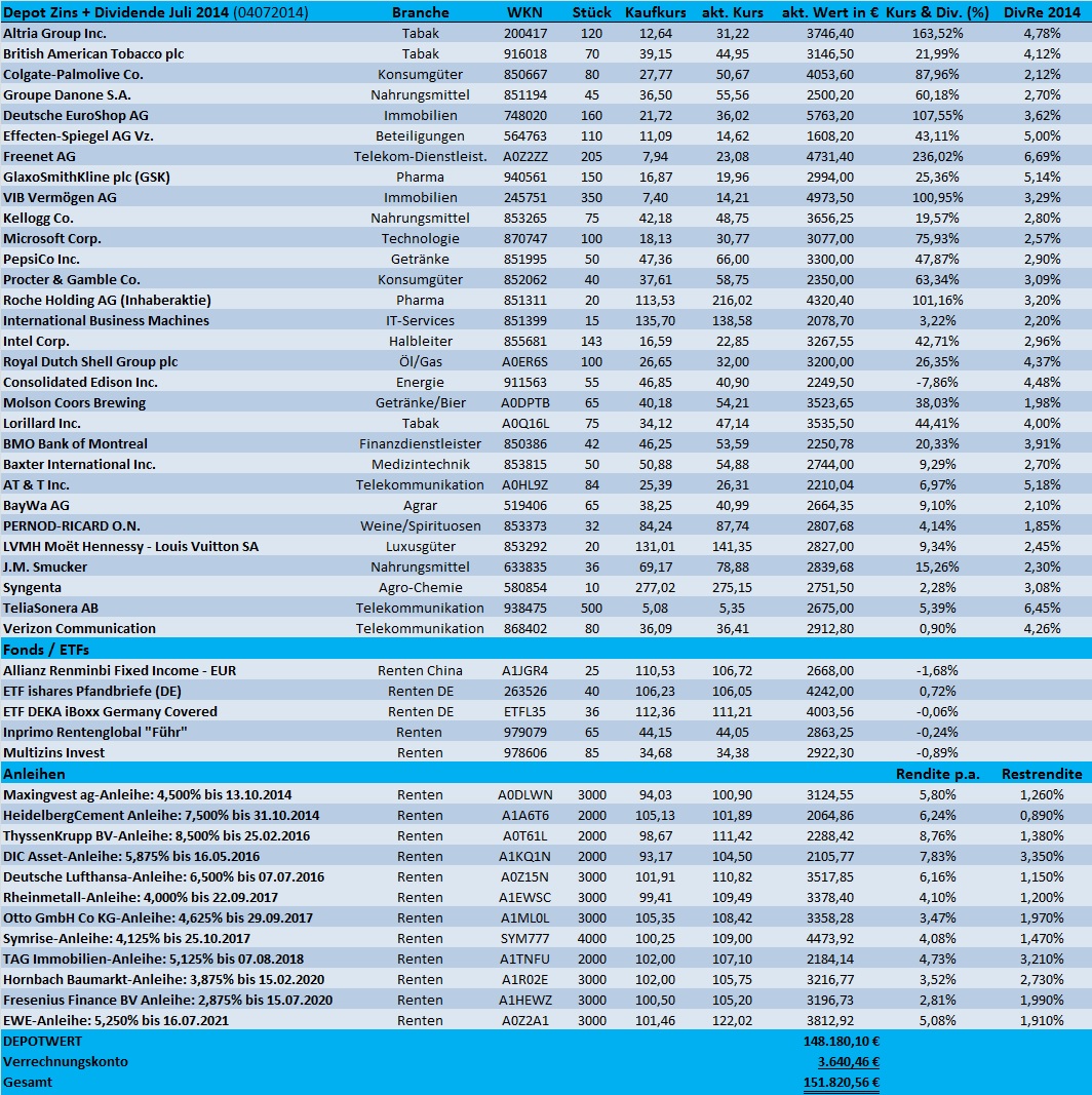 Tutti Mai 29, 2014 Anbei ein aktuelles Depot-Update für Mai 2014!! Eine detaillierte Aufstellung aller Depotpositionen, incl. Performance-Betrachtung, möchte ich nur noch im 2- oder 3-Monatsturnus erstellen. Im Mai gab es folgende Neuerwerbungen: Kauf 80 Stück Verizon Communication zu 35,84 € und 30 Stück Bilfinger SE zu 85,28 €. Abgaben sind nicht erfolgt, jedoch wurde der schöne Schäffler-Bond leider regulär gekündigt und ausbezahlt. Die Aktienquote erhöhte sich auf 66%. Das Depot konnte im Mai um 1,60% zulegen und die Gesamtperformance im Jahr 2014 beträgt zum 29.05.2014 jetzt 6,13%. Mein Depotwert stieg ggb. April von 137.662 € auf 141.244 € und der Kassenbestand beträgt incl. neuer Sparrate jetzt 5.062€. Neueinkäufe oder Aufstockungen sind auf jeden Fall geplant. Diese gehen aber eher Richtung Defensive. Dividenden-Erhöhungen im Mai gab es bei: IBM (16%) Bank of Montral (3%) Dividenden-Zahlungen im Mai gab es von: AT&T, Syngenta, BAT, Freenet, Colgate-Palmolive, Procter & Gamble, Effecten-Spiegel und Bank of Montreal Kupon-Zahlungen im Mai gab es von: DIC Asset, Schäffler Diesen Beitrag teilen Link zum Beitrag