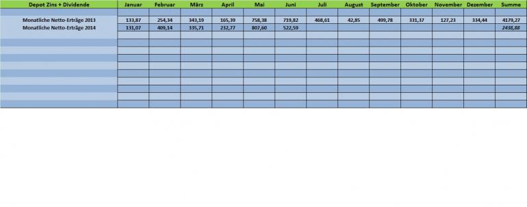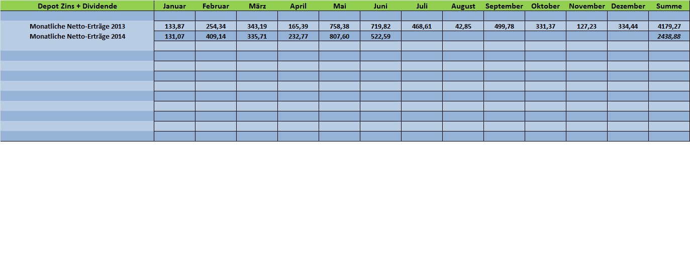 Tutti Juli 2, 2014 Anbei ein aktuelles Depot-Update für Juni 2014!! Eine detaillierte Aufstellung aller Depotpositionen, incl. Performance-Betrachtung erstelle ich per Ende Juli 2014 (vielleicht etwas früher, wenn es die Zeit erlaubt) Obwohl ich mich kurz über mich selbst geärgert habe.....bin ich letztlich doch ganz zufrieden, dass ich die Bilfinger-Position aufgrund eines "schlechten Bauchgefühls" nach 3 Wochen quasi "null auf null" abgegeben habe. Die gestrige Kursabstrafung der Aktie habe ich daher ziemlich verwundert verfolgt.....was für ein Timing-Glück!! Ich kann das "Bauchgefühl" für den Verkauf gar nicht erklären, denn ich halte die Aktie weiterhin für sehr interessant. Der Wert bleibt auf der Watchlist. Da ich im Moment einfach keine Lust mehr auf neue Einzelanleihen habe, fülle ich die Defensivabteilung im Depot nun wieder mit Anleihefonds- oder ETF´s auf. Die Kostenproblematik ist mir zwar bewußt, jedoch fühle ich mich mit diesen Produkten einfach viel wohler und das ist mir sehr wichtig. Im Juni gab es folgende Neuerwerbungen: Kauf 80 Anteile Multizins-Invest (978606) zu 34,68 EUR incl. Kosten und 65 Anteile Inprimo Rentenglobal "Führ" (979079) zu 44,15 EUR incl. Kosten. Verkauf: 30 Anteile Bilfinger am 12.06.2014 zu 85,59 EUR Die Aktienquote verringerte sich somit auf 63,74%. Das Depot konnte im Mai um 0,90% zulegen und die Gesamtperformance im Jahr 2014 beträgt nun zum 30.06.2014: plus 7,69% nach Steuern und Kosten. Der Wert des Depots stieg somit auf 146.481 EUR und der Kassenbestand beträgt incl. neuer Sparrate jetzt 3.466 EUR. Dividenden-Erhöhungen im Juni gab es keine. Dividenden-Zahlungen im Juni gab es von: PepsiCo, Shell, Deutsche Euroshop, Baywa, Kellogg, ConEdison, Molson Coors, Lorillard, Microsoft, IBM, Danone, Intel und Smucker Kupon-Zahlungen im Juni gab es von: iShares Pfandbrief ETF Die Auszahlungen sind ggb. dem Juni 2013 niedriger, denn damals gab es eine Kuponzahlung von Steilmann-Boecker und eine hohe Sonderdividende der Deutschen Grundstücksauktionen. Neue Investitionen sind in Planung, ich werde zeitnah berichten. Ausserdem überlege ich die "im Verhältnis" großen Positionen VIB und Freenet etwas zu stutzen und die Mittel anderweitig einzusetzen. Diesen Beitrag teilen Link zum Beitrag