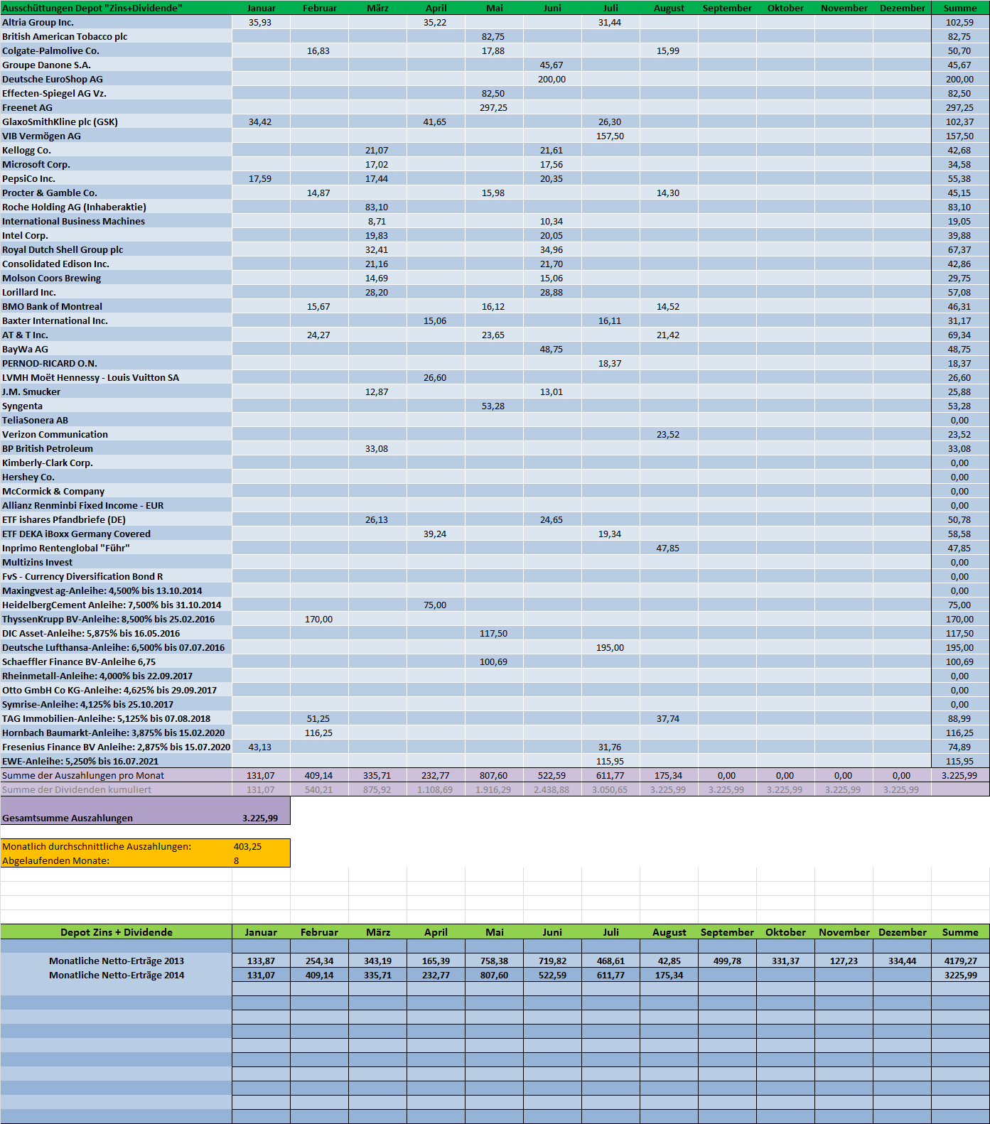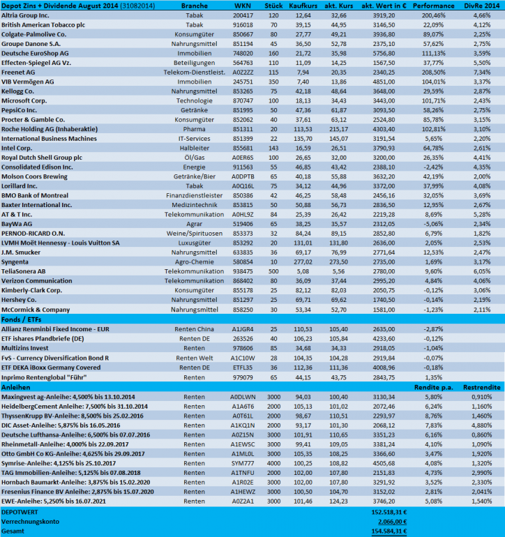 Tutti August 31, 2014 · bearbeitet August 31, 2014 von Tutti Anbei ein aktuelles Depot-Update für August 2014!! Diesmal gibt es überpünktlich eine neues Komplett-Update meines Depots "Zins+Dividende". Neueingänge: 25x Kimberly-Clark - 25x Hershey Co. - 30x McCormick&Company Abgänge: Teilverkauf Freenet Dividendenerhöhungen: Altria Group (8,30%) / Bank of Montreal (2,6%) Aktienquote aktuell: 63% Performance August: +1,55% Beste Aktien-Performance August: Molson Coors Brewing Schlechteste Aktien-Performance August: Baywa Gesamt-Perfomance 2014: +9,23% Ich habe die Performance der Einzelwerte jetzt endlich mit XINTZINSFUSS ausgerechnet und auch jede einzelne Dividende vor meinem Depotwechsel exakt berücksichtigt. Meine neue Depotbank hat leider nur die alten Einstandspreise übernommen, nicht aber die Ausschüttungen. Den Kursverfall bei Baywa hatten wir hier schon angesprochen. Der Wert hat sich nach den Zahlen zumindest wieder stabilisiert und ist leicht angezogen. Für einen Nachkauf besteht für mich aber noch kein Anlass. Eine meiner ältesten Position "Altria Group", hat in diesem Monat eine nächste Dividendenerhöhungen von 8,30% angekündigt und die Gesamt-Performance beträgt inzwischen sehr gute 200,46% (25,91% p.a.). Auch Microsoft hat es jetzt nach der Kurssteigerung mit einer Gesamt-Performance von 101,71% (26,07% p.a.) in den Club der 100%er geschafft. Sehr gut angezogen haben jetzt auch Intel, Molson Coors Brewing , Pepsi und RDS, während sich bei Syngenta, Pernod und LVMH kursmäßig gar nichts tut (was nicht unbedingt schlecht sein muss). Die etwas höheren Buchverluste bei ConEdision wurden inzwischen auch schon fast ausgeglichen. Ich bin mit der Auswahl der Einzelwerte sehr zufrieden, allerdings lässt sich eine so gute Entwicklung bei einigen wenigen Positionen wahrscheinlich nicht dauerhaft fortführen. Neuaufnahme prüfe ich aktuell. Eine gute Zeit!! Diesen Beitrag teilen Link zum Beitrag