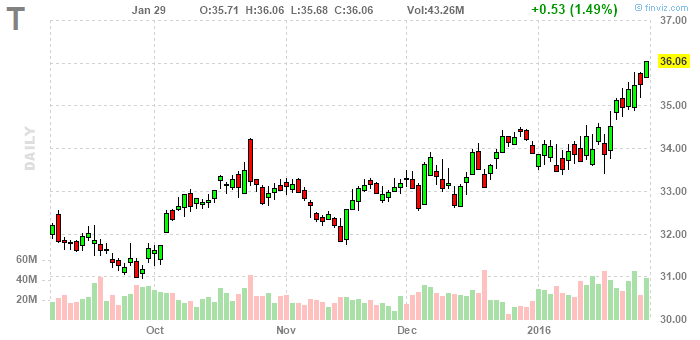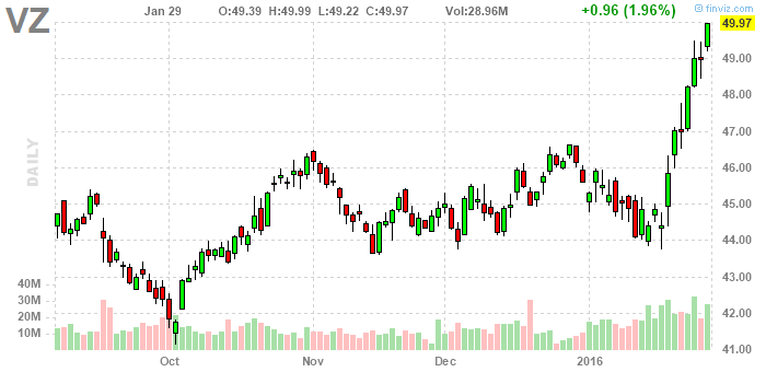 Beste Aktien-Performance Januar 2016: 1. Verizon (+8,19%) - 2. ConEdison (+7,49%) - 3. AT&T (5,58%)