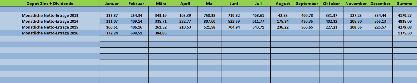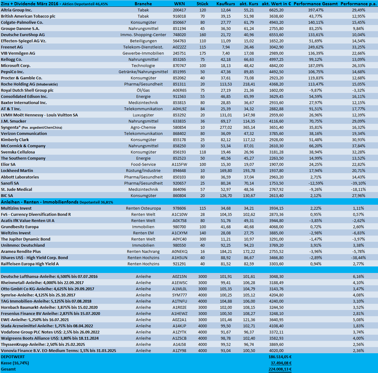Tutti April 2, 2016 DEPOT-UPDATE 03-2016 So....das erste Quartal ist vorbei und ich habe heute Abend endlich mal Zeit, mich wieder etwas intensiver um mein Depot zu kümmern und jede Einzelposition mal wieder im Detail aufzuführen. Dividendenerhöhungen März 2016: Effecten-Spiegel (+6,6%) - Deutsche Euroshop (+3,8%) - VIB Vermögen (+6,25%) - Colgate Palmolive (+3%) Beste Aktien-Performance März 2016: 1. Effecten-Spiegel (+11,4%) - 2. VIB Vermögen (+7,05%) - 3. Consolidated Edison (+6,69%) Schwächste Aktien-Performance März 2016: 1. Altria (-3,89%) - 2. Freenet (-3,52%) - 3. Roche (-3,09%) Dividenden und Kuhpongs März 2016: 394,85 € netto Depot-Performance März 2016: +0,75 % Depot-Performance 2016: +0,08 % Erstmals konnte das Depot in diesem Jahr "hauchdünn" im Plus abschließen, was u.a. auch an den Kursgewinnen bei den Anleihen und Anleihen-Fonds lag. Nach dem die EZB angekündigt hat, ab dem Monat Juni auch IG-Anleihen von "Nicht-Banken" zu kaufen, zogen hier die Kurse vorab deutlich an - die Vorfreude ist schließlich die schönste Freude -) Meine Mini-Position "Effectenspiegel" konnte nach einer Dividendenerhöhung auf 0,80 Euro/Aktie prozentual zweistellig zulegen. Der Titel wird weiterhin deutlich unter dem NAV gehandelt und die Dividendenrendite beträgt aktuell attraktive 5,3%. Ebenso gab es ein gutes Zahlenwerk der Immobiliengesellschaft "VIB Vermögen", bei denen ich jedoch lediglich "nur" noch mit dem Buchgewinn investiert bin. Leicht federn lassen musste Freenet, nach einer überraschenden Finanzbeteiligung an der Schweizer "Sunrise Communicatons AG". Neu aufgenommen habe ich einen europäischen Hochzinsfonds, den "Raiffeisen Europa High Yield A" und einen Hochzins-ETF von BlackRock, den "iShares $ High Yield Corporate Bond". In die aktuelle Marktstärke hinein abgegeben, habe ich beide Bankentitel aus Kanada. Die "Scotiabank" wurde exakt mit +/- Null und die "Bank of Montreal" mit einer Performance von +21,05% bzw. 7,37% p.a. abgegeben. Ich traue der aktuellen Charakteränderung des Marktes nicht sonderlich und rechne nach dem turbulenten Jahresauftakt mit einem weiteren schwierigen Marktverlauf. Finanztitel möchte ich daher aktuell lieber meiden. Ansonsten gibt es wenig zu berichten. Auffällig ist die aktuelle Stärke der US-Versorger und den beiden Telcos "AT&T" und "Verizon". Auch die Performance der sündhaft teuren "McCormick & Company" ist mit jetzt +66% sehr erfreulich. Der Titel konnte nach zuletzt starken Zahlen ein neues Allzeithoch erreichen und am Freitag wurde die 100$-Kursmarke geknackt - sehr ärgerlich, dass ich damals nur mit einer "halben Depotposition" eingestiegen bin -) Auch wenn meine Aktienquote im Moment eher die untere Bandbreite erreicht hat - bei neuen Aktienpositionen tue ich mich im Moment etwas schwer. Reizen würde mich weiterhin der eine oder andere Titel aus Großbritannien, jedoch generieren diese Titel den Umsatz zumeist im Inland und bei einem "Brexit" würde es gerade bei diesen Werten wohl zumindest kurzfristig zu größeren Verwerfungen kommen. Daher konzentriere ich mich im Moment eher auf die Themen "Ausschüttungen" und den Ausbau von Bestandspositionen. Meine Syngenta-Position habe ich jetzt angedient und falls die Übernahme durch ChemChina gelingen sollte, würde ich den Erlös vielleicht in "Scotts Miracle-Gro" tauschen - hier hatte ich bereits mehrmals (zuletzt im Februar) mit einem Einstieg geliebäugelt, den richtigen Moment aber immer wieder verpasst. Auch den Hersteller für Landschaftsgeräte "The Toro Company" hätte ich gerne mal in meinem Depot. Diesen Beitrag teilen Link zum Beitrag