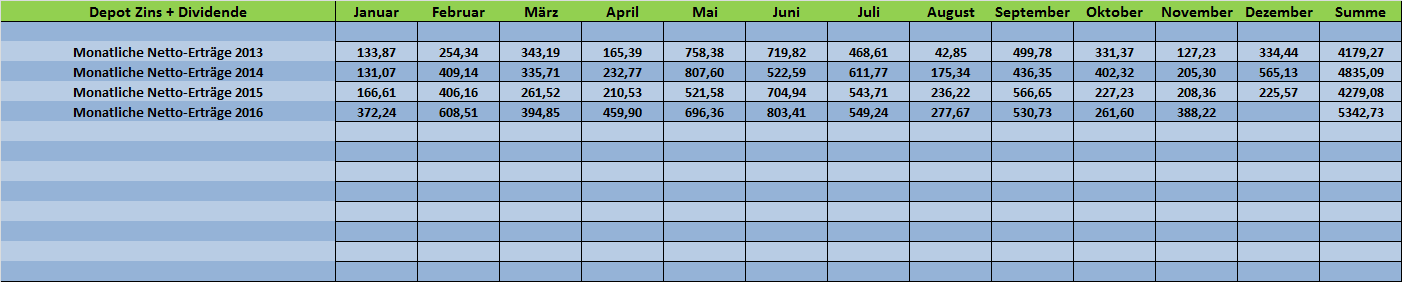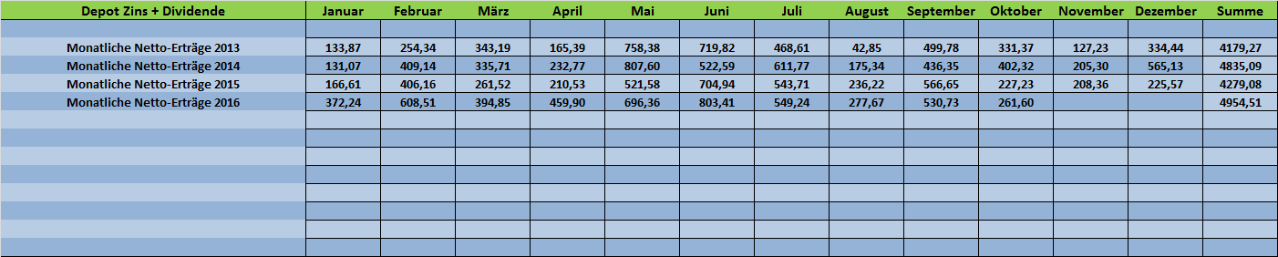 Tutti Oktober 31, 2016 · bearbeitet November 2, 2016 von Tutti AT&T nachgetragen DEPOT-UPDATE 10-2016 Ich bin´s mal wieder mit einem aktuellen Monats-Update. Auch wenn ich etwas früh dran bin....bis Donnerstag habe ich leider keine Möglichkeit eines Reports, so dass ich mit den Kursdaten von "Stand jetzt" arbeiten muss Dividendenerhöhungen Oktober 2016: Whitbread (+4,9%) - AT&T (+2,1% - am 02112016 nachgetragen) Top-Performer Oktober 2016: 1. LVMH (+10,1%) - 2. Microsoft (+7,2%) - 3. Lockheed Martin (+6,9%) Flop-Performer Oktober 2016: 1. Sky plc. (-11,4%) - 2. Pets at Home (-9,4%) - 3. Whitbread (-9,1%) Dividenden & Kuhpongs Oktober 2016: 261,60 €, netto Depot-Performance Oktober 2016: + 0,1% Depot-Performance 2016: 5,9% Im Oktober gab es für mein Depot eine regelrechte Zahlenflut, Ankündigungen von Übernahmen und jede Menge Ausschläge nach oben und nach unten - interessanterweise ist aber (wie in den vergangenen Monaten auch), nicht wirklich etwas passiert und der Oktober schließt wieder nahezu unverändert. Abgegeben habe ich die 2021er EWE-Anleihe, nachdem hier die Restrendite unter 0,5% p.a. gefallen ist. Der Erlös beträgt hier 7,68% p.a. vor Steuern - die Liquidität wurde umgehend reinvestiert in 210 Anteile des "Templeton Emerging Markets Bond Fund - A (Qdis) EUR" und außerdem wurde die "Roche-Position" auf 25 Stücke aufgestockt. Der Liquiditätsbestand erhöhte sich zuletzt auf 21%. Jede einzelne Unternehmensnachricht zu kommentieren würde wohl fast den Rahmen sprengen, aber ein paar Details will ich doch aufführen. Komplett negativ haben sich im Oktober die Anfangspositionen der Inselaktien entwickelt, auch mit Unterstützung des schwachen britischen Pfunds. Auch wenn z.B. Sky, BAT (die Company übernimmt die restlichen RAI-Anteile) und Whitbread gerade ein ordentliches Zahlenwerk vorgelegt haben, am Markt löst das aktuell nur ein Achselzucken aus -)))) - für mich kommt das nicht überraschend, denn die Unsicherheit über die weitere Brexit-Entwicklung ist ja weiterhin vorhanden und das darf auch gerne noch andauern. (@Kontron: "The Restaurant Group" habe ich auch erst durch ebdem kennengelernt - das Unternehmen verweilt bereits seit längerem in meiner WL "Restaurants & Bars") Zu den Top3: Sehr positiv möchte ich die Zahlen von LVMH hervorheben, da bin ich wirklich sehr zufrieden - Microsoft konnte abermals mit den Quartalszahlen und insbesondere mit dem Cloud-Dienst "Azure" überzeugen, die Aktie hat daher auch ein neues Allzeithoch erklommen - Lockheed Martin hat am letzten Dienstag ganz starke Zahlen präsentiert und die Gewinnprognose für das laufende Geschäftsjahr recht deutlich angehoben. Rüstungsaktien kommen für viele Investoren ja auf keinen Fall in Frage - aber ich halte diesen Sektor anlagetechnisch in den kommenden Jahren für sehr sicher: Beispiel Auffallend positiv ist im Oktober auch die Entwicklung der Hochzins-Rentenfonds gewesen - hier habe ich in diesem Jahr einen echten Performance-Treiber und das für mich schwierige "Renten-Jahr 2015" ist daher abgehakt -))) Wie geht es weiter? Ich habe da ganz tief in mir immer noch ein wenig Bauchgrummeln und ein Gefühl, dass der Markt nach hinten wegkippt (was für uns Permakäufer-innen ja nicht schlecht sein muss). Ich halte es auch gut für möglich, dass wir am 08. November mit Mr. Trump eine Überraschung erleben könnten und das dürfte Mr. Market womöglich gar nicht schmecken - zumindest besteht hier für mich ein immenses Überraschungs-Potenzial (Brexit lässt grüßen). @Dudelinode / bounce Cardinal Health hat heute Zahlen gebracht und hier scheint das Negative jetzt womöglich seit Freitag eingepreist zu sein - ich bleibe dennoch vorerst in Lauerstellung und werde punktuell entscheiden. 1-2 Investments sollen es in diesem Jahr aber schon noch sein. Eine gute Zeit!! Diesen Beitrag teilen Link zum Beitrag