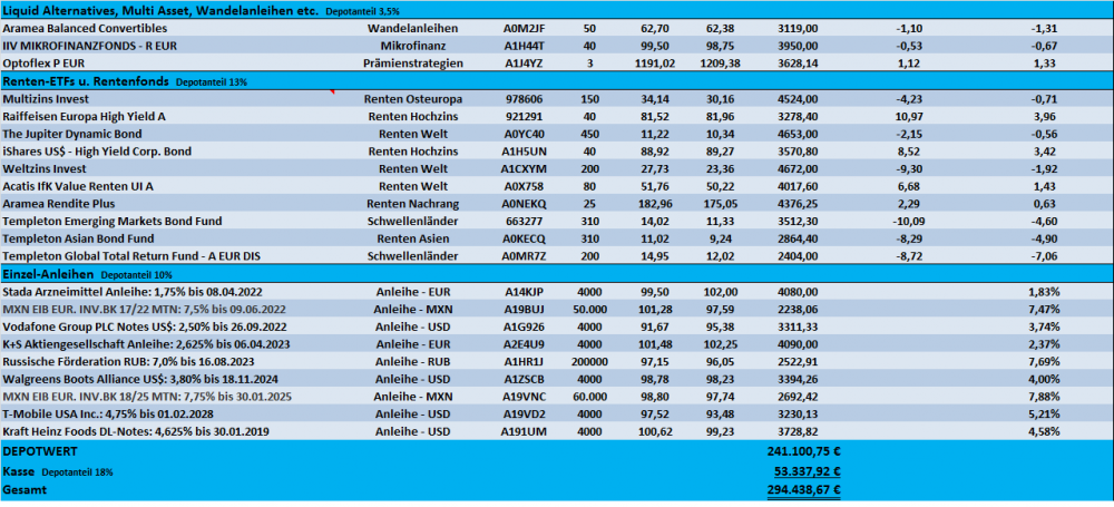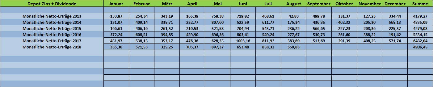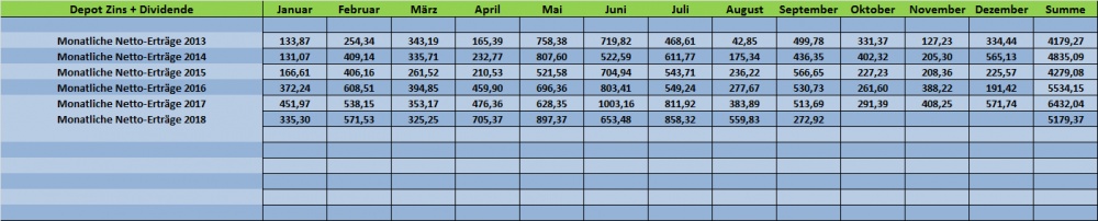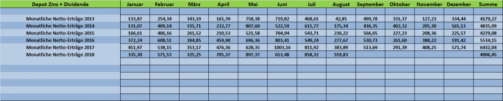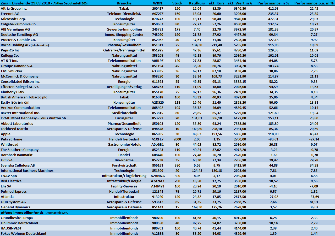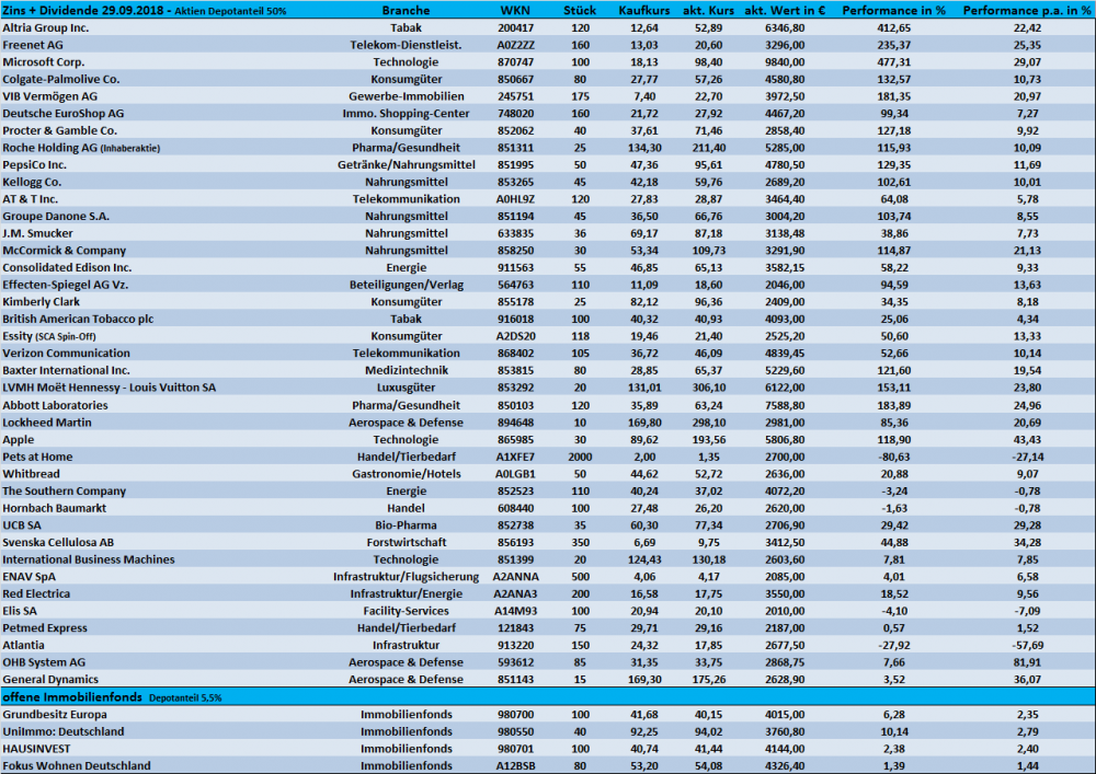 Tutti September 29, 2018 · bearbeitet Oktober 1, 2018 von Tutti Am 22.09.2018 um 13:47 schrieb Schildkröte: Aber letztlich braucht man auch im Aktienbereich reichlich Geduld und eine Bären- äh pardon Schildkrötenruhe. Auf jeden Fall @Panzer Da in diesem Monat ja nichts mehr wesentliches tun kann, komme ich bereits heuer mit einem Monatsupdate. Habe nach längerer Zeit mal wieder eine Zusammenfassung aller Titel aktualisiert Zugänge/Abgänge: Kauf: 30 Anteile "Southern Company" Dividendenerhöhung September 2018: Lockheed Martin (+10%) - Microsoft (+9,5%) - Verizon (+2,1%) Top-Performer September 2018: 1. Abbott Laboratories (+10%) - 2. Lockheed Martin (+8,1%) - 3. General Dynamics (+7,1%) Flop-Performer September 2018: 1. Freenet (-9,7%) - 2. OHB (-6,4%) - 3. Con.Edison (-4,7%) Ausschüttung September 2018: 272,91 €, netto Performance September 2018: +0,14% Performance 2018: +1,19% Eigentlich gibt es nicht sonderlich viel zu berichten. Nach der Aufstockung von "The Southern Comp." gab es keine weiteren Transaktionen von mir. Der Gesundheitskonzern Abbott Laboratories entwickelt sich weiterhin zu einem echt tollen Investment und die starke Monatsperformance von LMT und GD konnte man(n) eigentlich fast schon erwarten (zu meinem letzten Update) - Stärke gebiert eben Stärke -)). Zu Freenet habe ich nichts wesentliches gefunden. Die Aktie bleibt weiterhin vollständig in einem Abwärtstrend. Ich halte dennoch viel von dieser Dividendenaktie und überlege eine Aufstockung zu tätigen. Diverse Marktteilnehmer rechnen hier wohl mit schlechten Nachrichten und verkaufen. Die Dividendenrendite für 2019 beträgt sehr hohe 8%....Hmm. Nichts besonderes gibt es von meinen Kaufkandidaten zu berichten. IBM schaut imho weiter interessant aus und die Zahlen zum dritten Geschäftsquartal am 16.10.2018 werden vielleicht zeigen, in welche Richtung der weitere Kursverlauf geht. Die Aktienquote stieg zuletzt auf exakt 50%. Sollte es in diesem Jahr an den Märkten zu keinem größeren Rücksetzer kommen, so erreicht das Depot "vielleicht" noch in 2018 eine weitere Etappe. 300 TEuro - das hätte ich noch 2013 hier nicht für möglich gehalten. "Stärke gebiert Stärke" - im Nachgang sollte ich auch mal meine Position bei "McCormick Company" erwähnen. 2014 als halbe Depotposition in den Bestand genommen, hat sich der Weltmarktführer für Gewürz- und Gewürzmischungen auch toll entwickelt. Einen neuen Schub gab es aktuell durch das Zahlenwerk für das 3. Geschäftsquartal. Die Bewertung ist aber inzwischen auch nicht ohne...... Diesen Beitrag teilen Link zum Beitrag